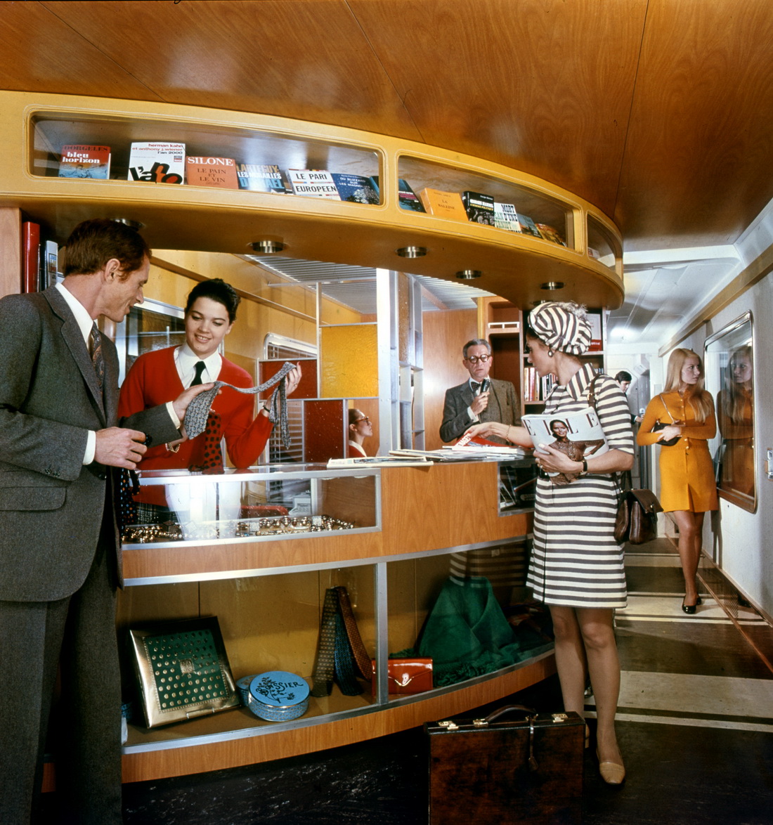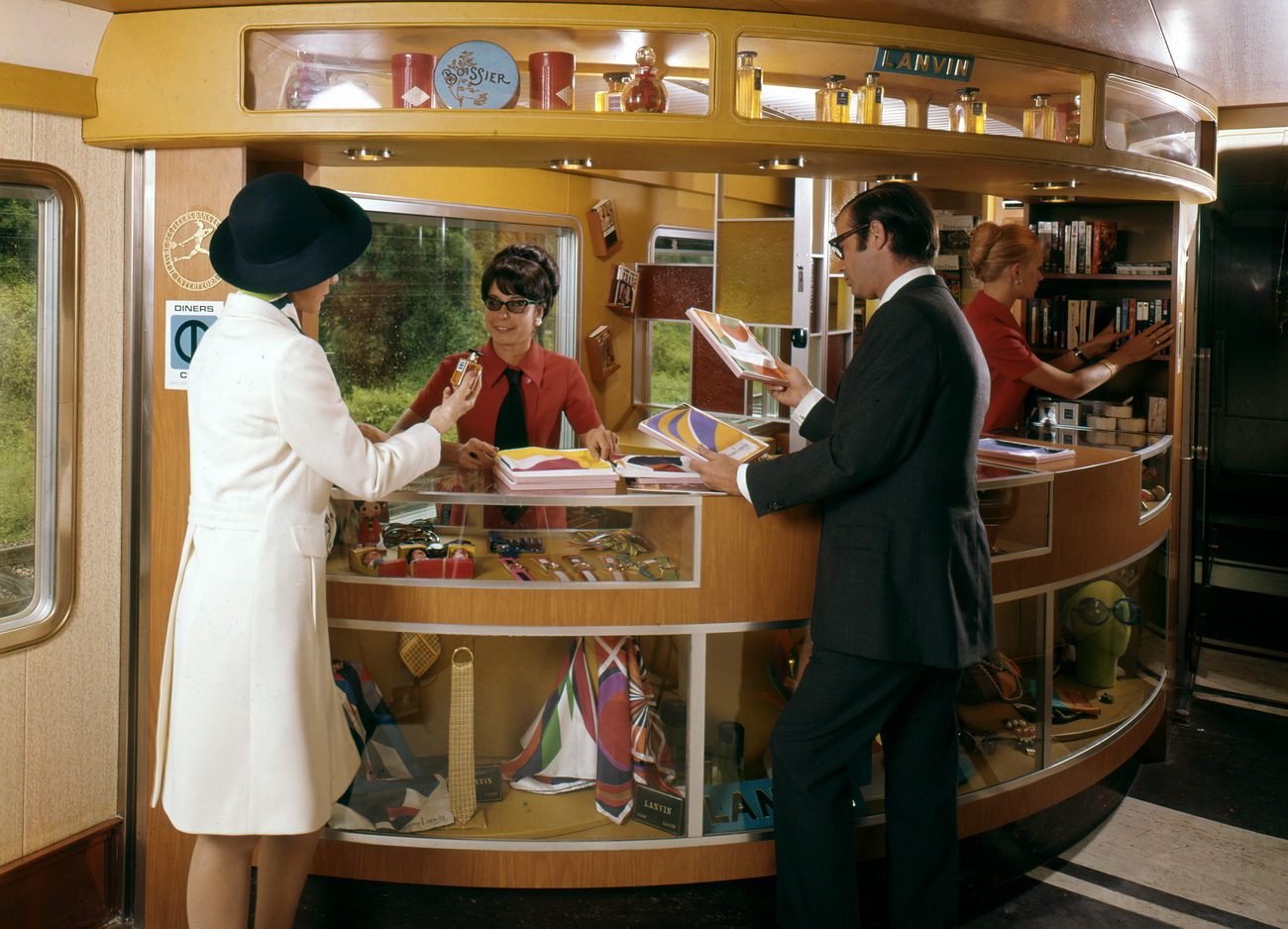 Avec toutes les chutes, j\'ai fait des présentoirs à bijoux, montres, crayons Parker, foulards (rouge et vert) et leurs boites blanches (tout à droite du comptoir) et au centre la fameuse boîte à confiseries de la maison \"Boissier\". ...Mais je n\'ai pas le bleu azur correspondant....