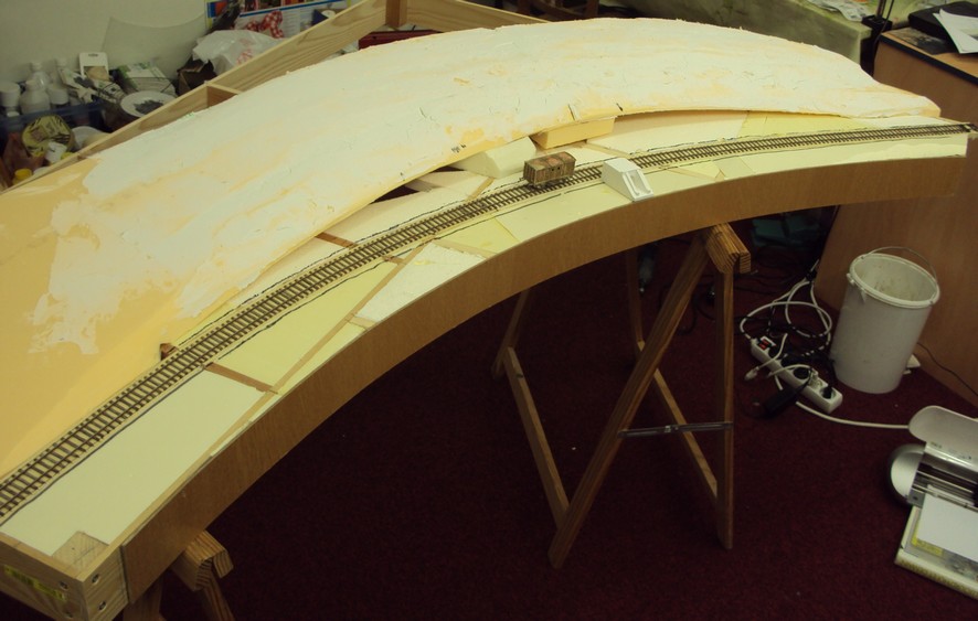 Pendant que la Silhouette découpe des tuiles (en bas à droite), une photo du second module. J'ai comblé tous les vides et je pourrai finaliser le relief. J'ai fait passer le véhicule le plus long pour ne pas engager le gabarit (le coup de la HM m'a servi de leçon) Un aqueduc PN Sud modélisme est arrivé il me permettra de ramener l'eau des fossés vers l'avant du module.