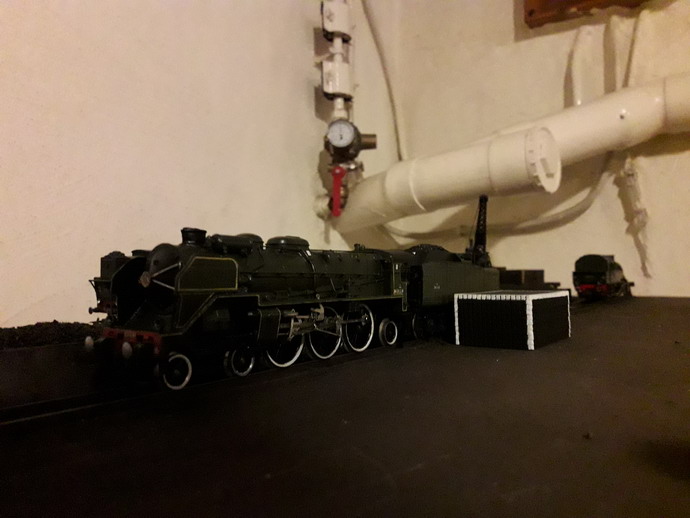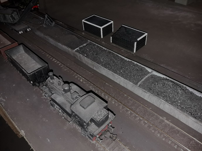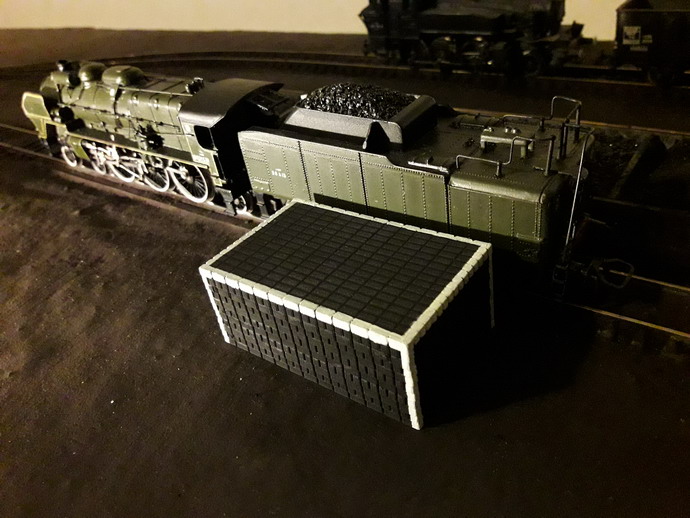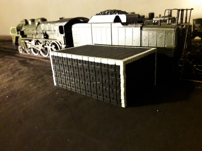 J'ai terminé le premier tas de briquettes, celui qui est complet. Je me suis interrogé à le placer entre deux fosses à scories pour le basculage des feux. D'après ma doc les tas de briquettes sont implantés un peu n'importe où dans le parc à combustible. Curieusement, je le trouve un peu petit. Heureusement il y en a un autre qui sèche. J'ai des difficultés à peindre les chants de cartons qui sont hyper absorbants.