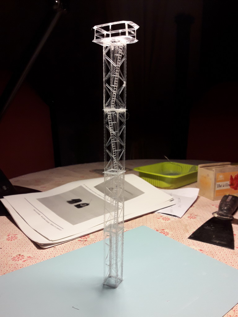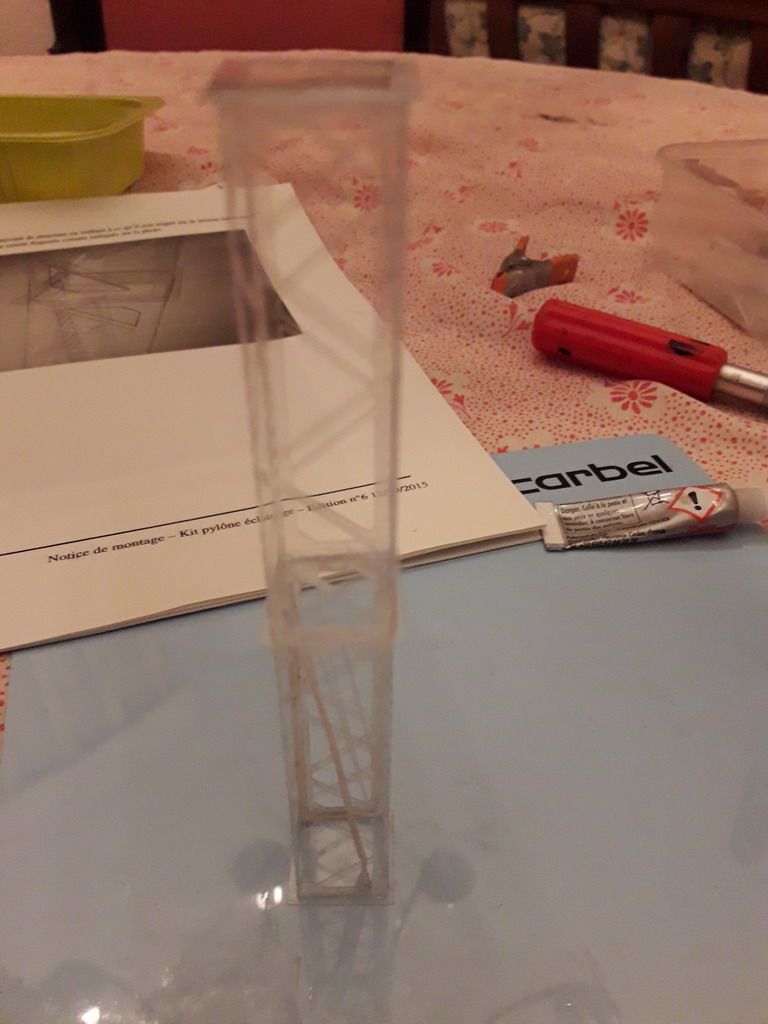 L'ossature du pylône est terminée. Il faut y allez piano. Deux heures de montage dans la notice qu'ils disent...C'est de la dentelle hyperlégère et il ne faut pas éternuer. J'ai maintenant de la technique. Enduire de colle l'élément à assembler en entier est une erreur. il faut positionner d'abord avec un point de colle le recouvrement, maintenir avec des mini pinces style pince à linge et laisser sécher. Le couteau de peintre que l'on aperçoit a servit au pliage. Donc mal voyant, sauf les myopes qui ôtent leur lunette se passent de loupe, ceux qui ont un pouce à chaque doigt et sensibles au pollen, passent leur chemin. :lol: :lol: :lol: