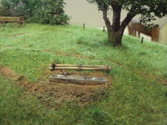 L’arbre est terminé, j’ai appliqué un peu de turf sur la base du tronc. L’abreuvoir est en voie d’intégration, rien n’est sec.