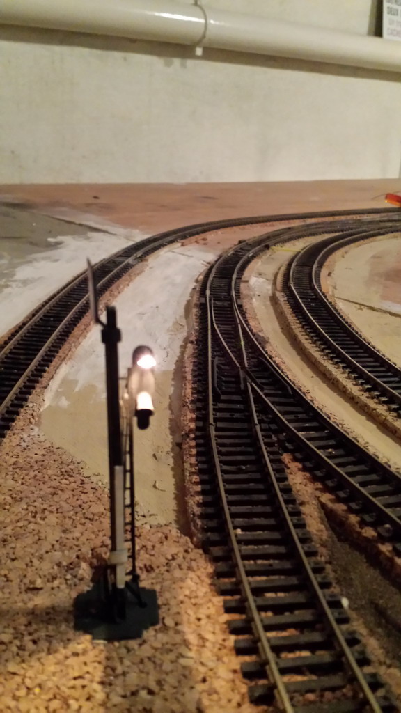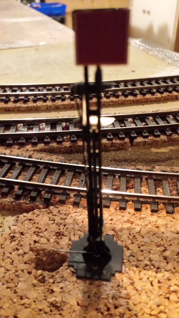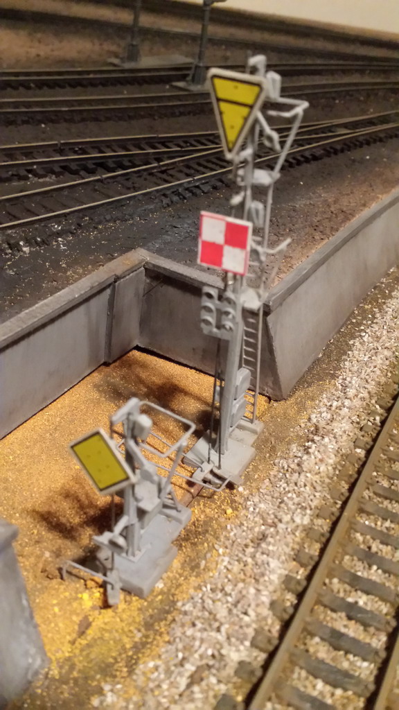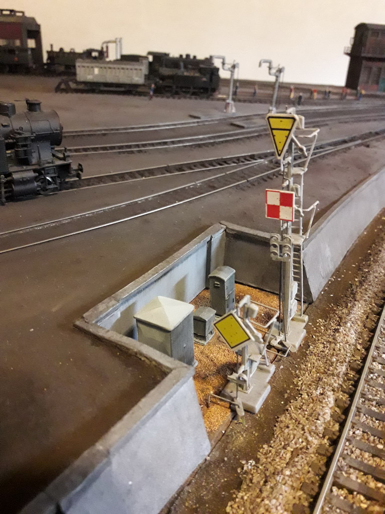 L'installation la plus avancée est celle d'un signal combiné avertissement, carré et rappel de ralentissement. L'arrangement des feux va être jouissif…Sur les cibles lumineuses jumelles il y a de haut en bas:
