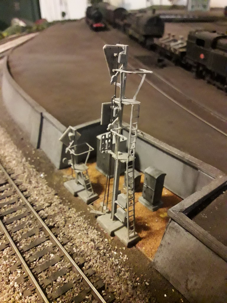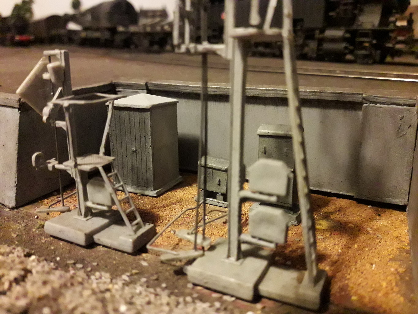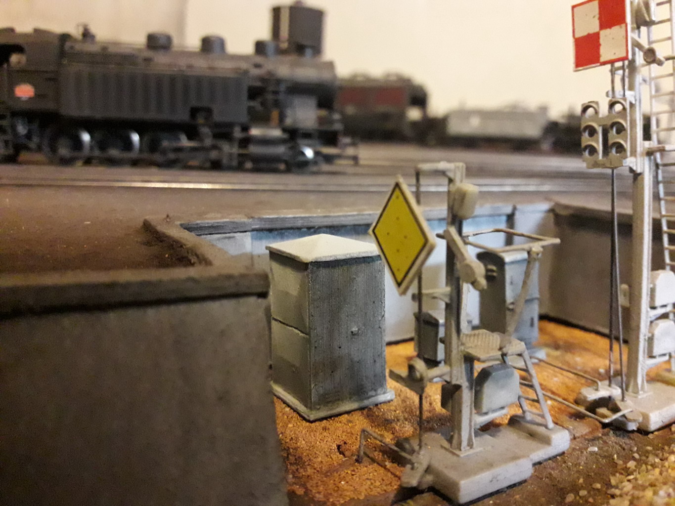En attendant, j'ai reçu les armoires électriques et les boites à piles. Elles sont en résine et après un travail d'ébarbage, la mise en peinture a été délicate. La peinture Humbrol mat (140) persistait a rester satinée par endroit. Après plusieurs essais , j'ai fini par y mettre de la peinture en bombe Tamya du gris medium sea mat et terminer à la terre à décor. Bon je me suis planté, j'ai confondu une armoire électrique de signalisation NS avec une caisse à piles superposée :redface: . Je vais arranger ça.