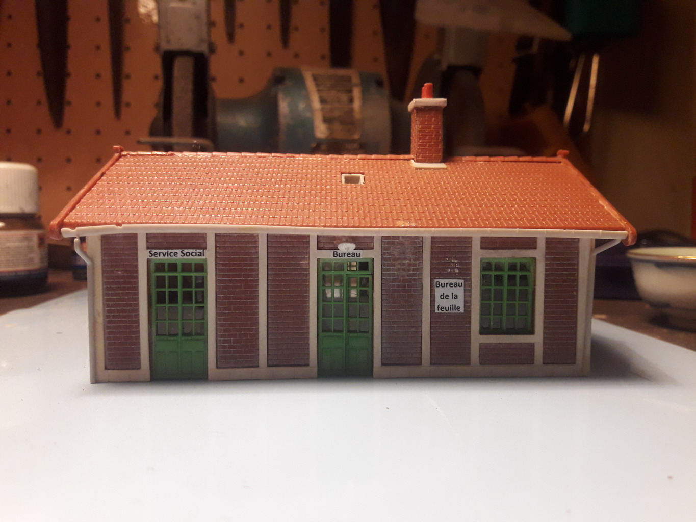 J'ai mis de coté le pylône. Des travaux extérieurs pour ma maison ralentissent l'avancement du réseau. Ma Dremmel a rendu l'âme. Il semblerait qu'un fil de bobinage du rotor soit cassé. En attendant j'ai acheté sur eBay le bureau de la feuille MKD d'occasion, monté et cheminée manquante. J'ai commencé par en fabriquer une et complété les tuiles faitières manquantes. (on agrandit en cliquant sur les photos).