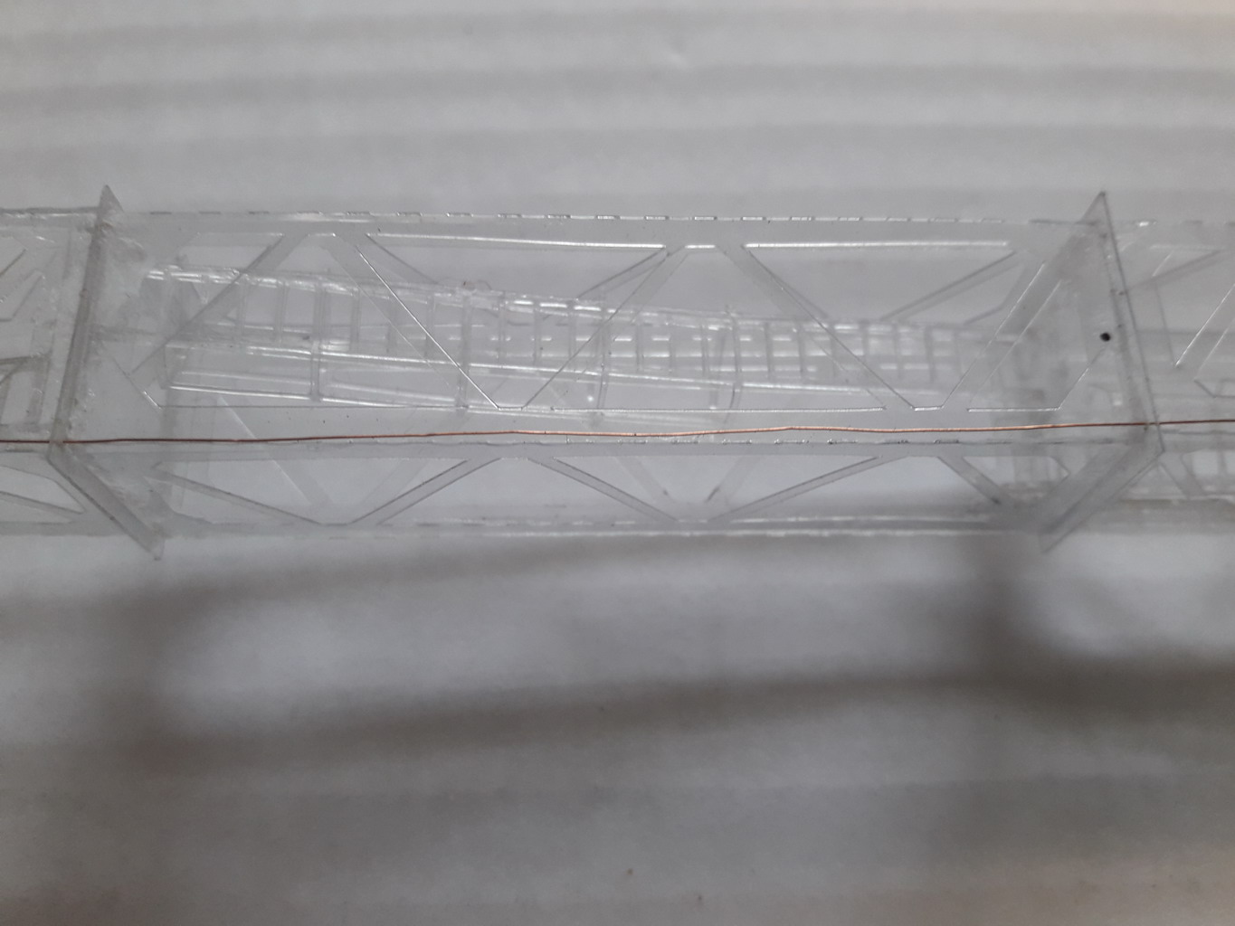 Retour sur le pylône d'éclairage. Je n'ai pas plus suivre l'exemple de Biscatrain qui a fait courir deux fils de cuivre à l'intérieur des cornières. Il était déjà monté. Ce sera pour le deuxième Pylône. J'ai pus débobiner un rotor Rivarossi d'un moteur HS. J'avais un Jouef que je n'avais pas pu faire. J'a donc percé à l'extérieur au droit des cornières qui seront orientées à l'abri des regards, à 0.35mm pour y passer le fil très mince. J'ai tendu le fil pour y mettre un pont de colle: