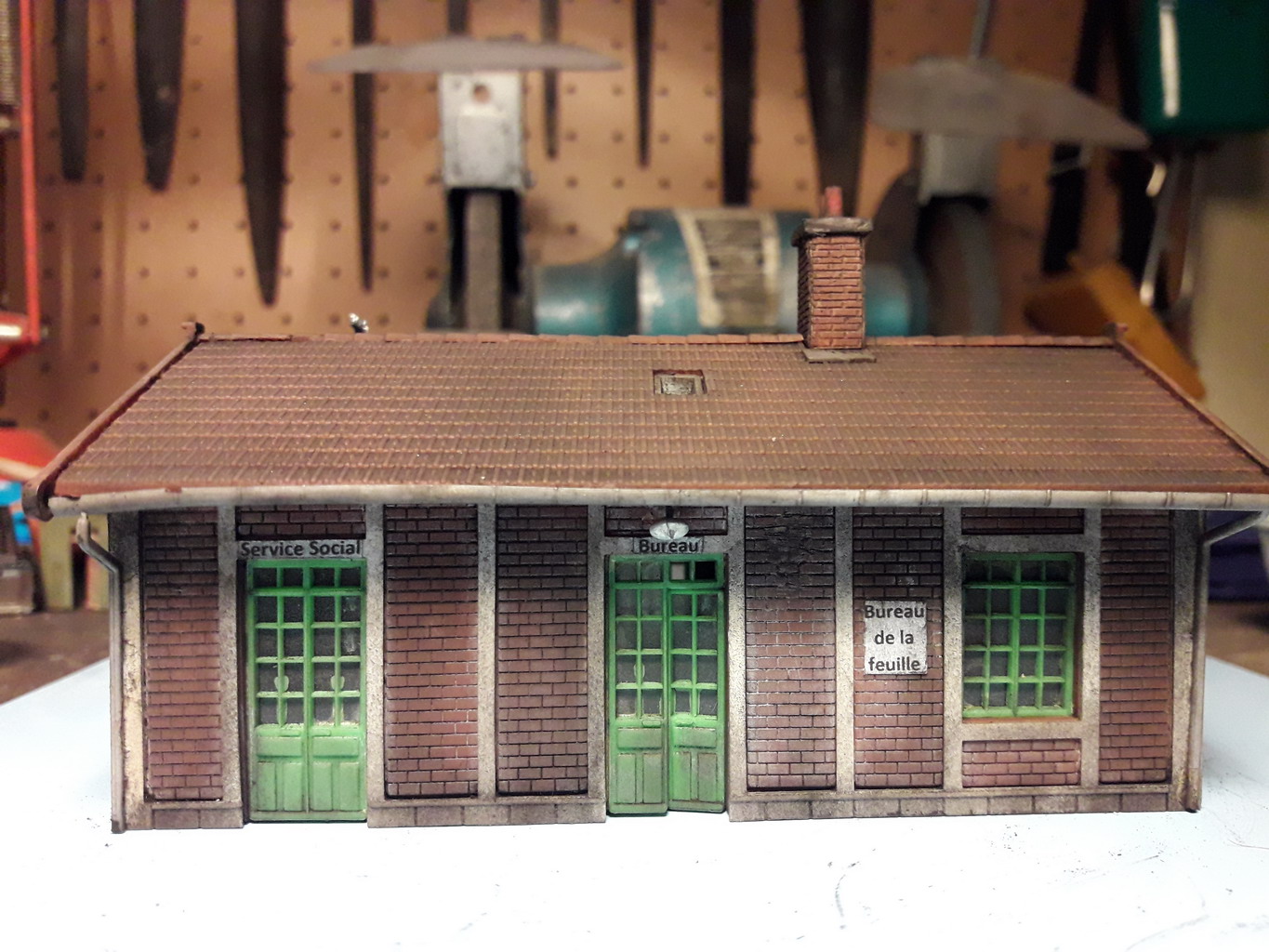 J'ai mis de coté le pylône. Des travaux extérieurs pour ma maison ralentissent l'avancement du réseau. Ma Dremmel a rendu l'âme. Il semblerait qu'un fil de bobinage du rotor soit cassé. En attendant j'ai acheté sur eBay le bureau de la feuille MKD d'occasion, monté et cheminée manquante. J'ai commencé par en fabriquer une et complété les tuiles faitières manquantes. (on agrandit en cliquant sur les photos).