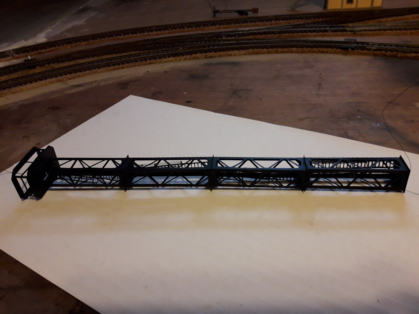Posés à l'extérieur, les fils restent discrets. Ce Pylône sera en arrière plan entre l'atelier et le parc à combustible. Pour l'autre pylône qui sera près de la plaque tournante, je passerai les fils à l'intérieur des cornières verticales de la structure.