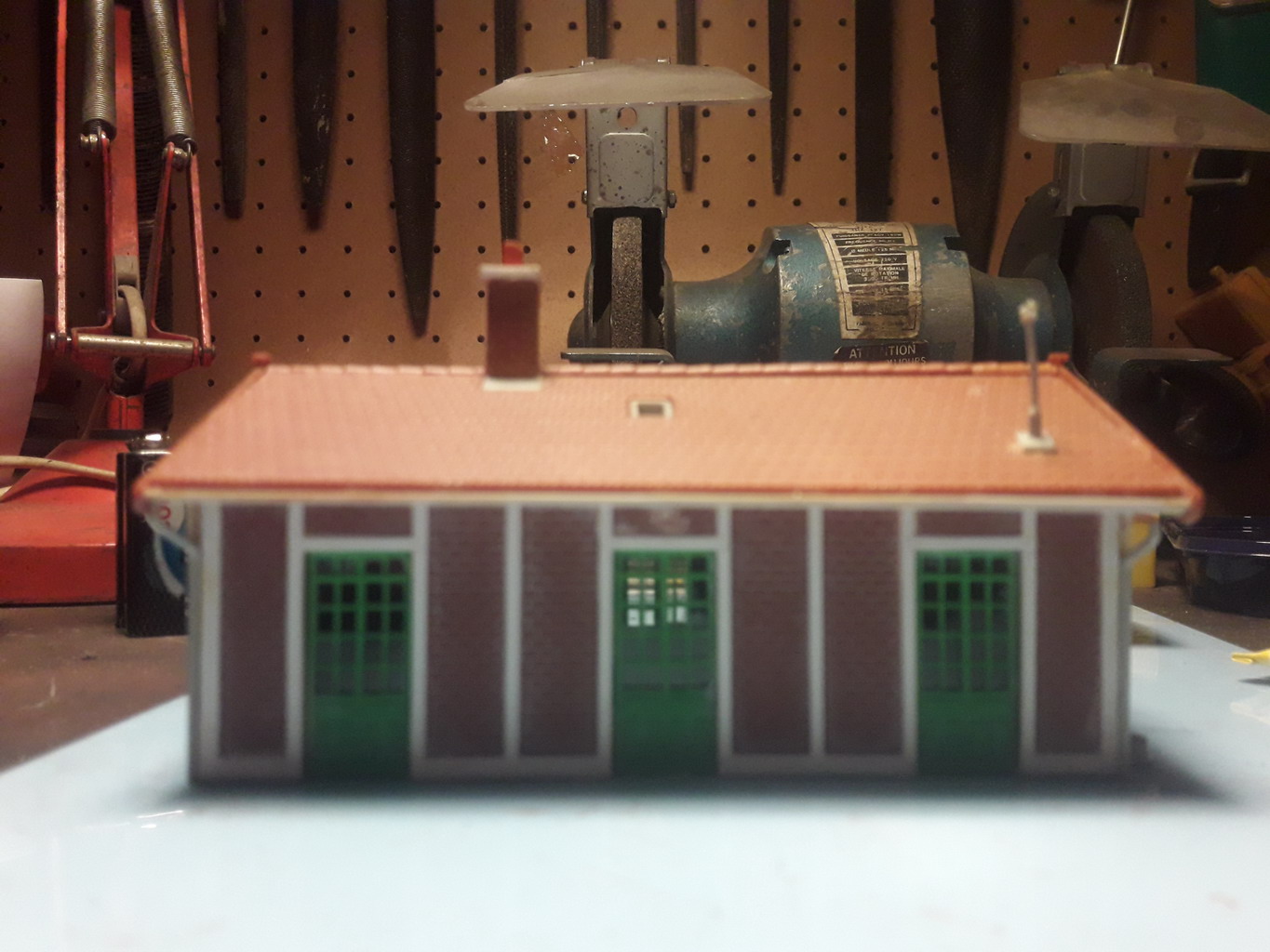 J'ai mis de coté le pylône. Des travaux extérieurs pour ma maison ralentissent l'avancement du réseau. Ma Dremmel a rendu l'âme. Il semblerait qu'un fil de bobinage du rotor soit cassé. En attendant j'ai acheté sur eBay le bureau de la feuille MKD d'occasion, monté et cheminée manquante. J'ai commencé par en fabriquer une et complété les tuiles faitières manquantes. (on agrandit en cliquant sur les photos).