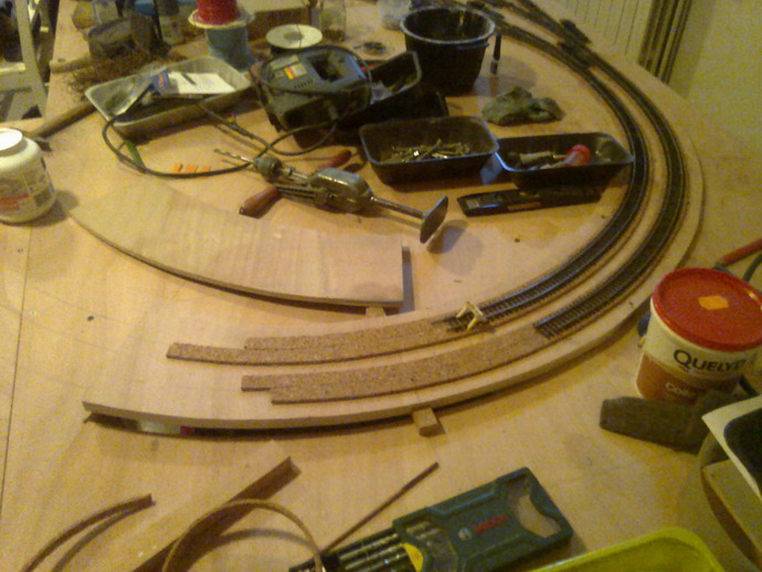 J'ai découpé le liège un peu plus large que les traverses puis recoupé dans le milieu. Cela permet de mieux le cintré en courbe.