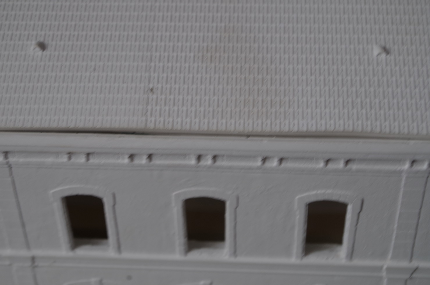 Le dessous des toits comportent beaucoup de matière. J'ai poncé sur une épaisseur de 1 mm environ il y en a encore trop ; sans compter qu' au départ il y avait à chaque angle des boursouflures de près de 5 mm. La limite entre tuiles et dessous de toit des annexes se confond. Le ponçage et le limage sont délicats.