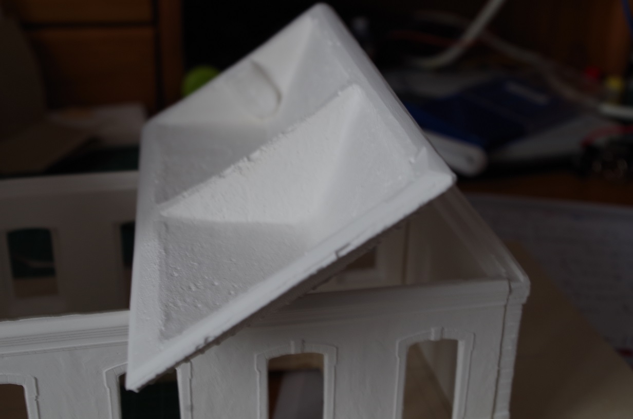 Le dessous des toits comportent beaucoup de matière. J'ai poncé sur une épaisseur de 1 mm environ il y en a encore trop ; sans compter qu' au départ il y avait à chaque angle des boursouflures de près de 5 mm. La limite entre tuiles et dessous de toit des annexes se confond. Le ponçage et le limage sont délicats.
