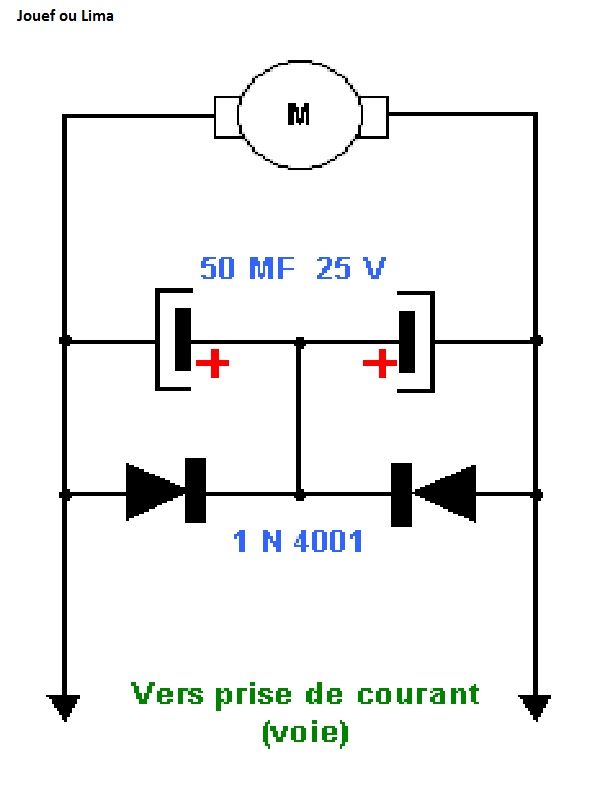 Merci à tous . Pour moi c'est un problème de place. Je trouve les condensateurs trop gros. Je vais voir ça. Maintenant ils ont dû diminuer en taille. Par contre, pour les machines avec prise de courant en diagonale …pôle plus sur la machine et moins sur le tender et inversement..(RIVAROSSI, LILLIPUT). En ce qui concerne les rails gras, c'est exclu en rampe, si on veux des longueurs de convoi digne de ce nom...