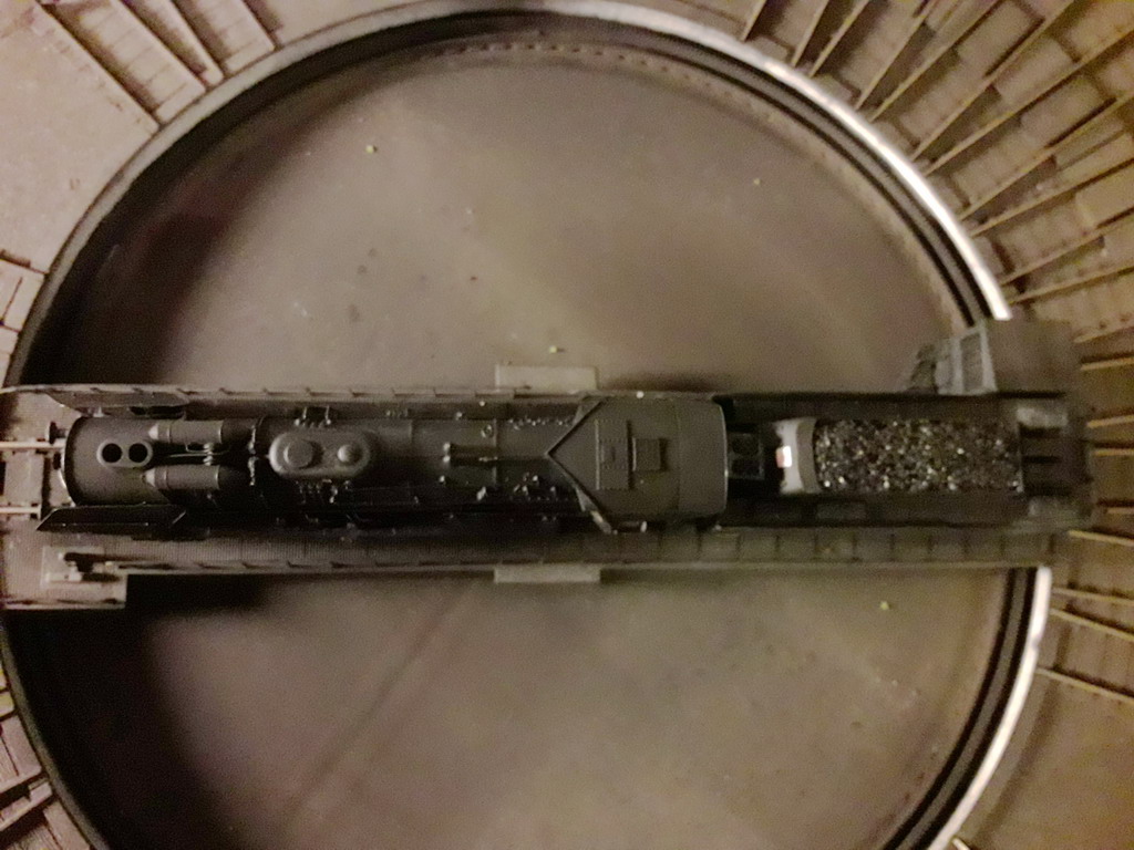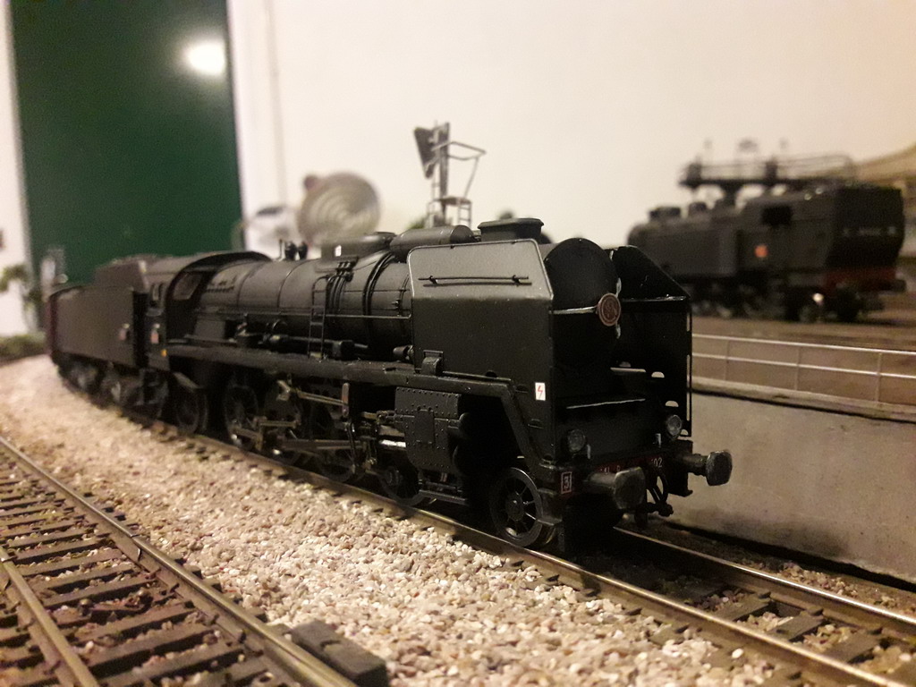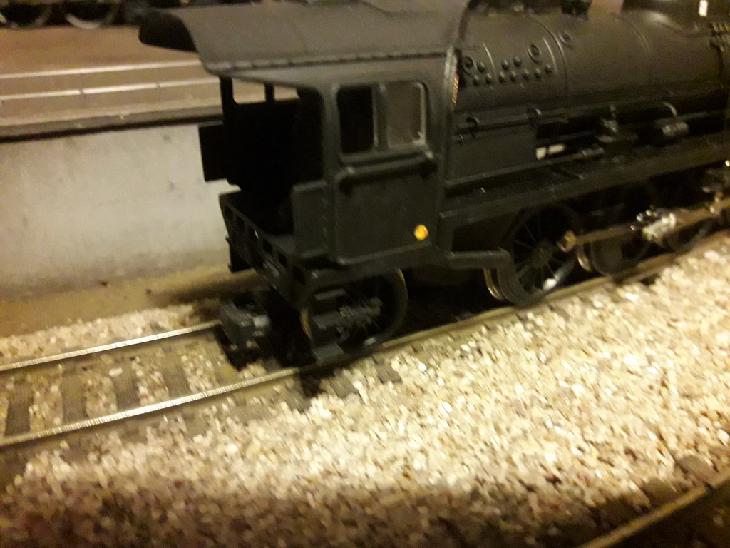 Mise au point assez longue car la machine ne tirait plus que 7 voitures en rampe. Réglage de la pression des palpeurs prise de courant de l'attelage machine-tender et changement des bandages d'adhérence ROCO contre des Jouef. Les performances sont bonnes. Je dois refaire des vidéos qui ne sont pas satisfaisantes. La voici en essais en rampe avec une composition standard de 9 voitures et 1 fourgon.