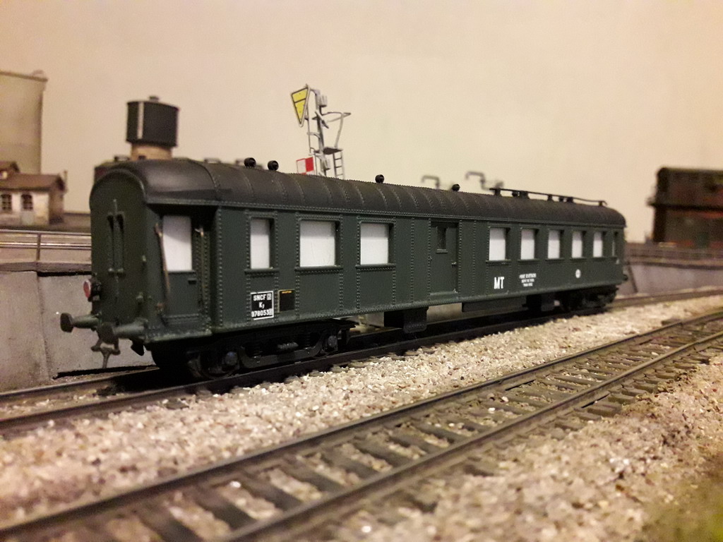 Retour sur mon train de secours. J'ai donc repris la B4d OCEM RA de Jouef Champagnole qui est sans aménagement intérieur. Le modèle ne correspond pas à une reproduction exacte. J'ai évidemment supprimé les soufflets, repeint la toiture et la caisse, raccourci les attelages et utilisé les marquages AMF 87 (très fragiles) pour une affectation à Fives. Je n'ai pas complété les marche pieds à cause de l'inscription en courbe.