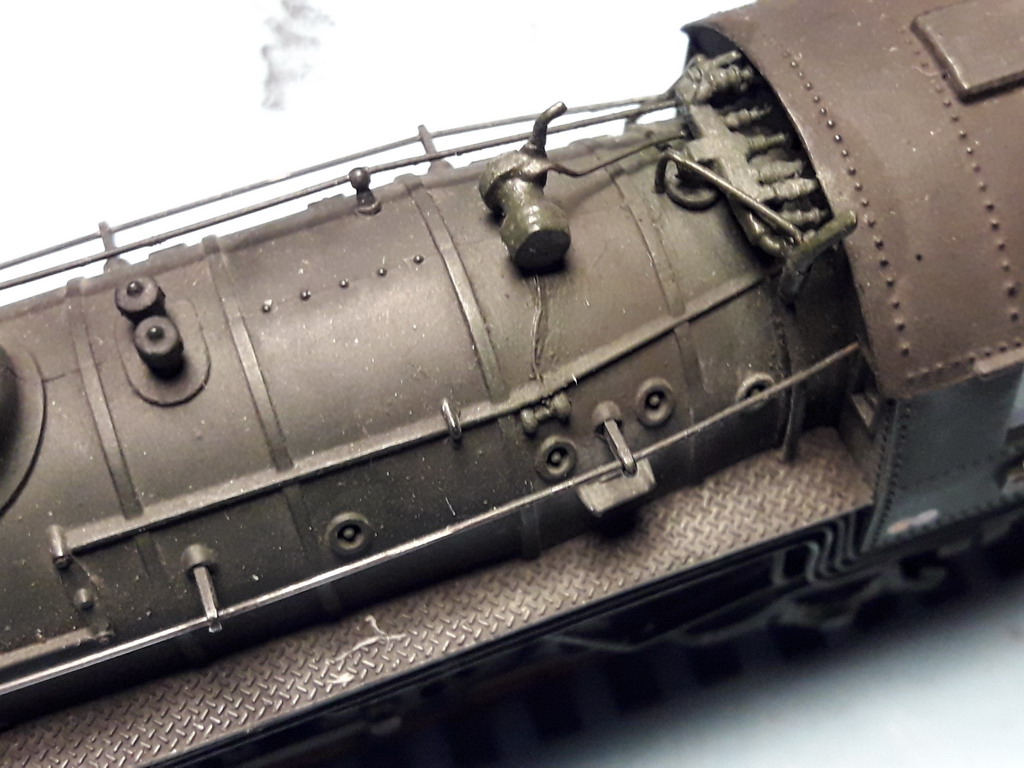 j'ai donc complété l'alimentation vapeur de la pompe à eau chaude (non encore montée) par une tubulure partant de la chapelle située au dessus de la chaudière. La-dite chapelle sera complétée par des volants de manœuvre (pas encore trouvé avec quoi je vais les faire). L'échappement du réchauffeur est posé, restent les tuyauteries. Une couche primaire de peinture a été faite autour de la cheminée. Le Kylchap équipait les R de 701 à1340, ce qui est visible.