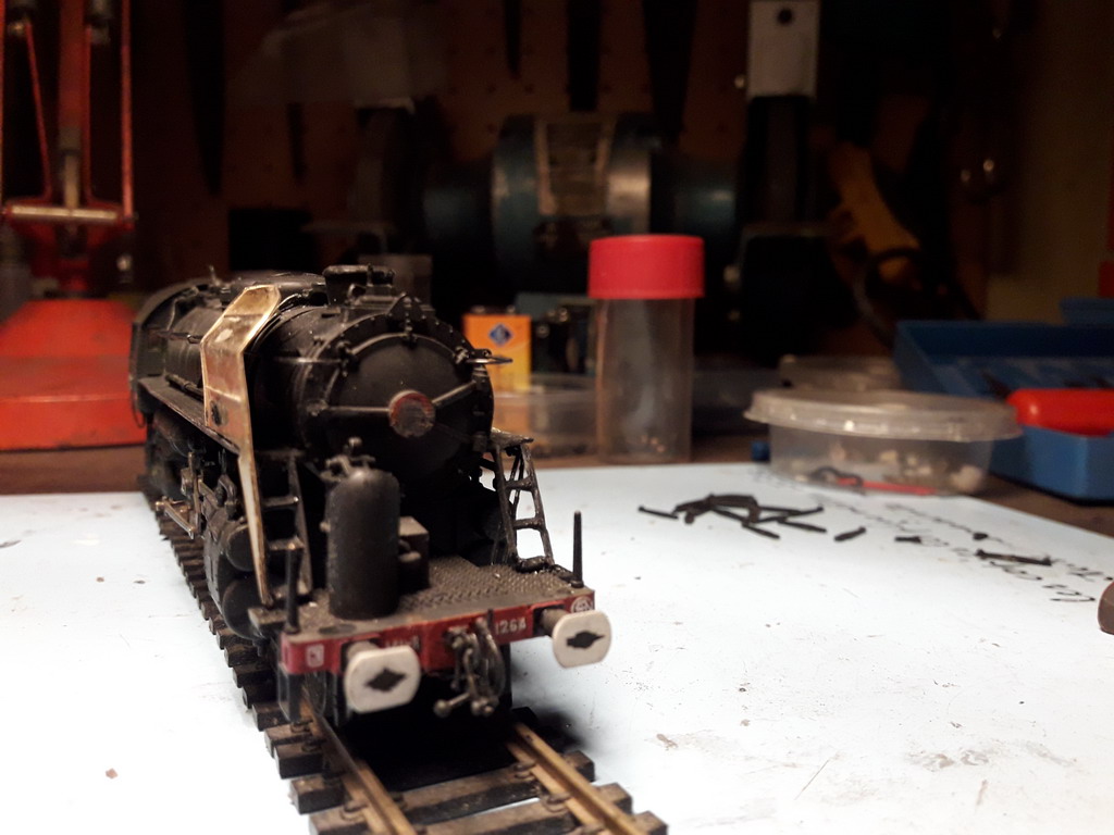 Ayais...je me lance….Suppression du pare-fumée droit. Il faut y aller doucement avec plusieurs passes au XActo avec une lame neuve. Avant d'attaquer le long du tablier, il faut détacher l'échelle avec une lame de rasoir qui est beaucoup plus fine. C'est aussi à la lame de rasoir que j'ai dégagé le volant de la porte en prenant soin de le récupérer. J'y ai rajouté un bout de plastique percé pour la continuité de la barre du Y. La pompe à eau chaude à été enlevée. Je vais essayer de lui rapporter des bidules pour la rendre plus conforme. De même pour la pompe à air. J'ai enlevé le macaron SNCF pour travailler.