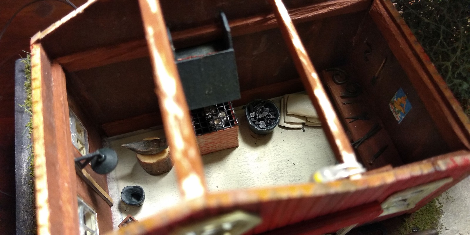 Une petite forge basée sur un modèle à monter de "Blair Line" (je crois). J'ai fabriqué les outils avec de l'argile (attention le temps de cuisson au four !) et j'ai improvisé pour le reste. L'édifice est éclairé ainsi que la forge mais je n'ai pas encore branché les DELs. Les détails viennent d'un peu partout plus construction intégrale.