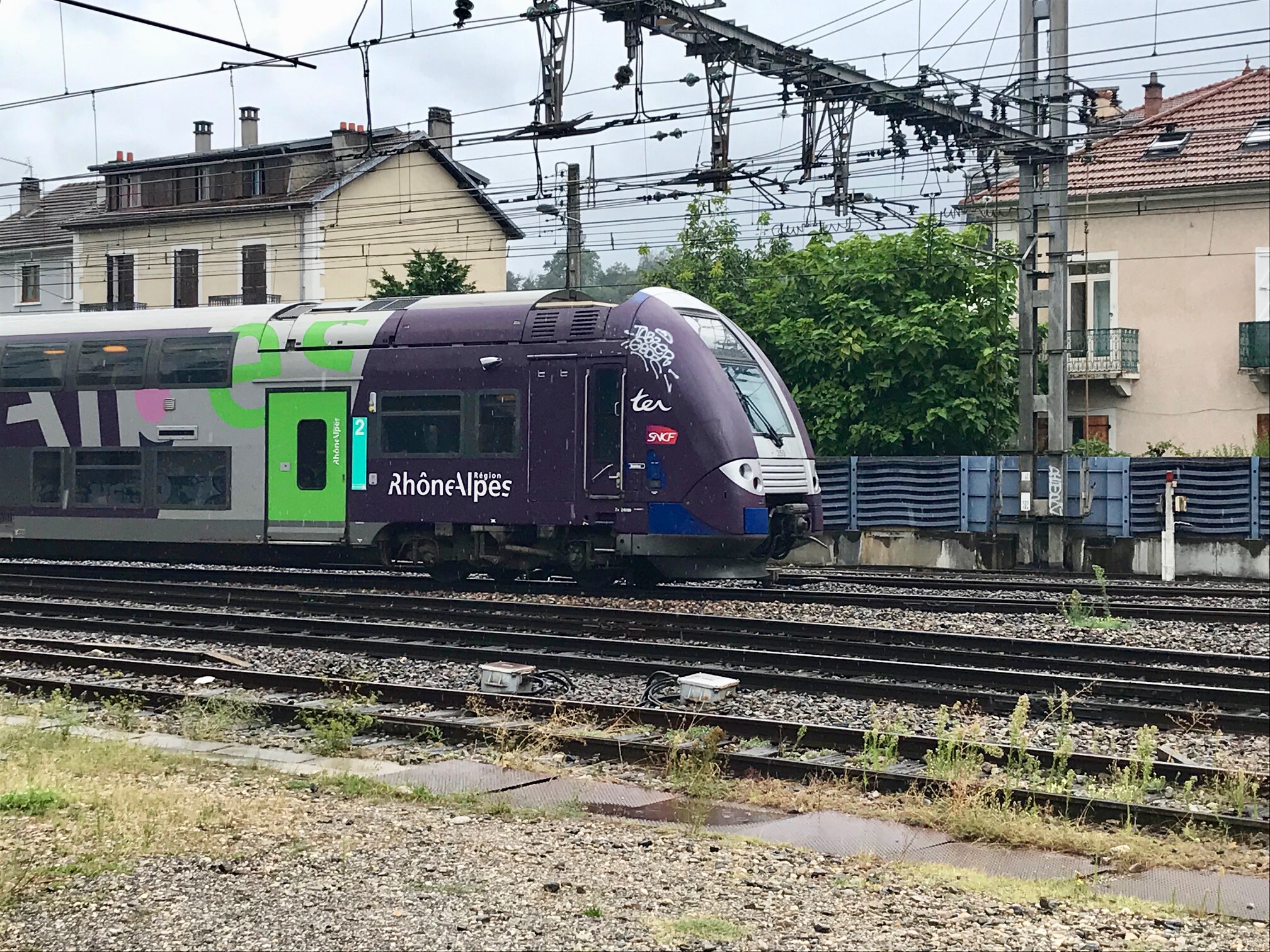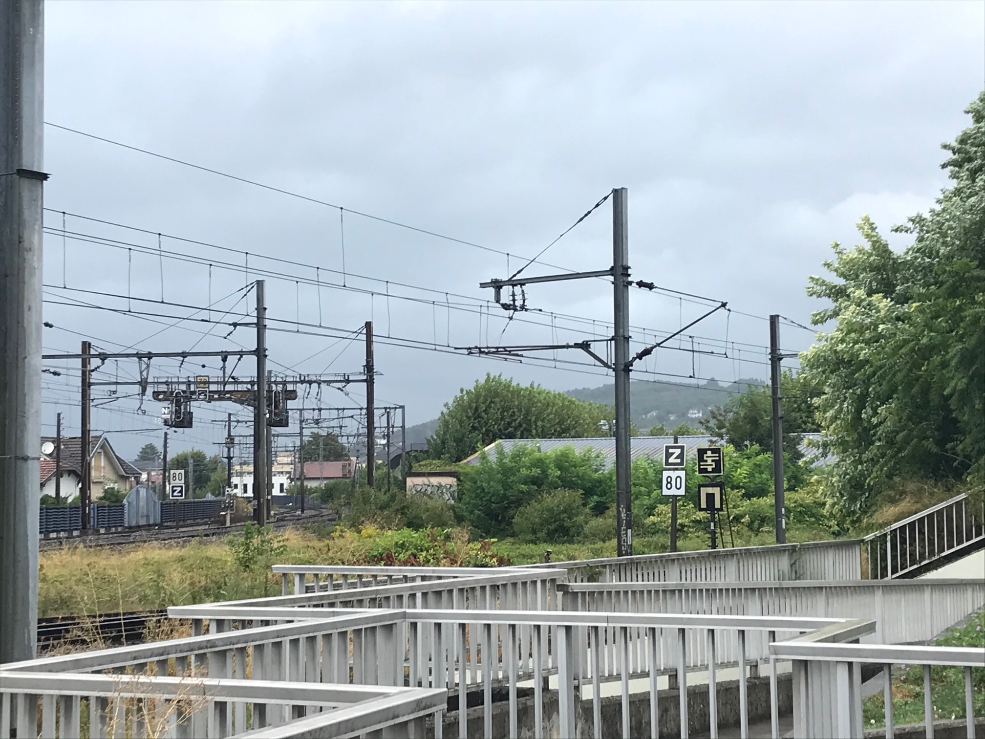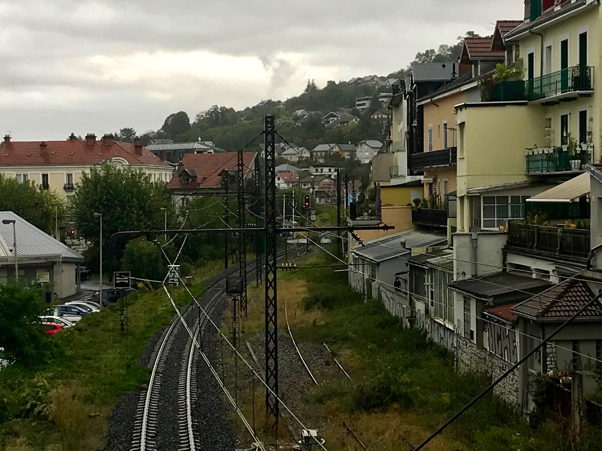 Nous sommes à Aix les Bains, au départ de la voie qui part sur Annecy: celle-ci est, au départ de la gare d'Aix en "fausse" double voie car une des 2 voies part en impasse du côté nord du BV: voie sous 25 kV 50Hz