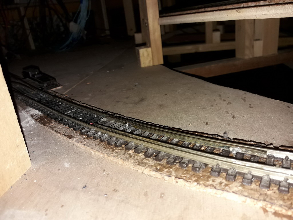 . La voie semble légèrement déformée après l'aiguille du faisceau de la gare cachée voie 2. Enfin, seule la 241P HJ déraille, sois l'essieux du tender ou un des essieux moteurs de la machine où les deux. Incompréhensible …Elle passait bien avant. Cette partie en courbe à deux tronçons éclissés qui partent de l'aiguillage jusqu'à la voie courbable de 1m de l'héloicoïdale