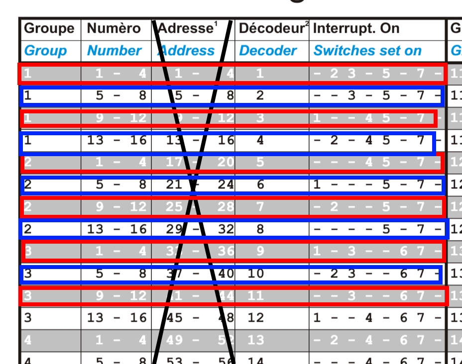 Ou alors un seul bouton peut faire la commande en mode On/Off et dans ce cas tu pourrais faire 16 aiguilles d'un coup. Ce qui correspondrait peut être aux 4 lignes du tableau dans la colonne "group"