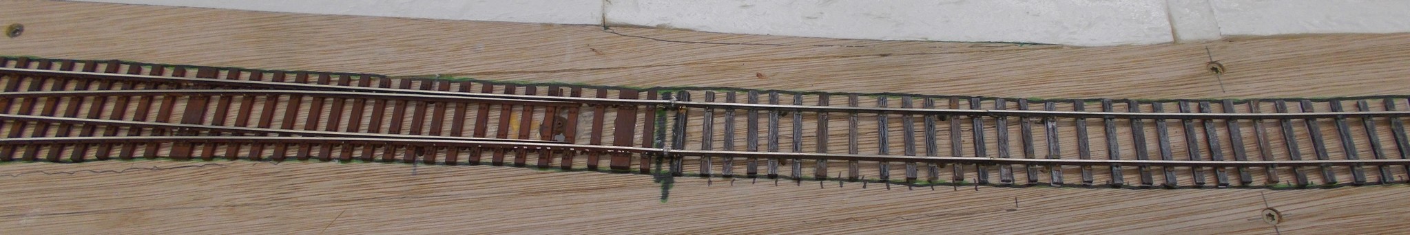 a) aiguillage Weinert long : 1 couche à l’aéro de Tamyia XF68 (pour l’accroche) + 2 couches de HB 187 diluée passées au pinceau. Attention à l’utilisation des éclisses Weinert normales et isolantes, elles ont un sens. Me suis fait avoir et ai eu quelques désagréments !