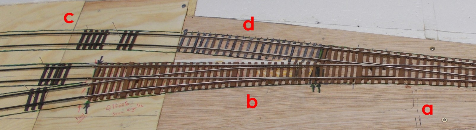 Voici une vue des 2 modules assemblés provisoirement (il me manque des éclisses isolantes Weinert qui ont été commandées). Sur le premier les fils pour l’arrivée du DCC sont déjà en place. Les cœurs des aiguillages ont eu leurs fils. Les fils sont à chaque fois doublés par précaution. Si une soudure lâche, il m’en restera un pour assurer la continuité électrique. Les trous pour le moteur Cobalt IP sont faits sous les 2 aiguillages. Sur le second, je devrai compenser la différence de hauteur en mettent de la carte plastique sous l’aiguillage. Dès à présent la place des éclisses isolantes est prévue. La gestion se fera par Train Controller.