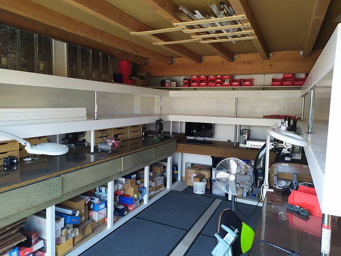L’infrastructure sur laquelle reposeront les modules est à peu près terminée. L’endroit où est le bureau n’est en suspens (il manque la structure du réseau du bas) car un poste de travail déplaçable sera glissé en-dessous.