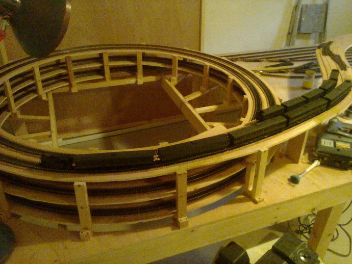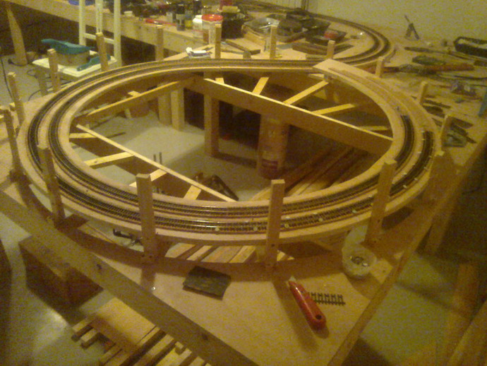 Attention aux hélicoïdales. S'il est prévu des rames longues ( 9 voitures et un fourgon ou 24 wagons de marchandises et un fourgon) il faut des pentes douces aux environs de 2 pour cents. Pour ma part mes rayons font 610 et 670mm ce qui me fait un écart de 80mm entre deux niveaux . C'est hyper juste et c'est réservé aux vapeurs (et diesel) la caténaire étant exclue. Pour un écart plus grand 10 ou 12 cm il faut augmenter le rayon pour cette déclivité. Par expérience, il faut diviser par 2 le nombre de véhicules tractés par rapport au profil en palier avec cette déclivité et ces rayons. J'ai 24 cm entre les deux niveaux de roulement. Le niveau inférieur est à 80 cm du sol
