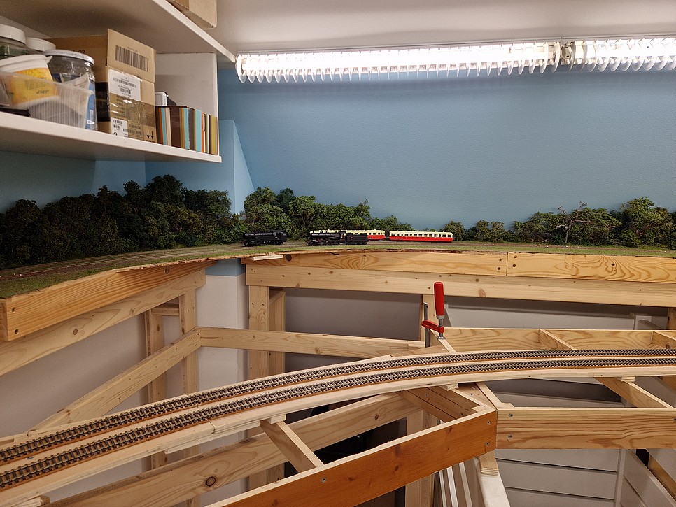 Le module sortie de la gare de stockage VU est à peu près terminé et en place. L’avant de la gare sera caché par une forêt qui arrivera du réseau inférieur. La partie sous l’étagère est plus sombre. Il faudra éclairer cela avec des LEDs