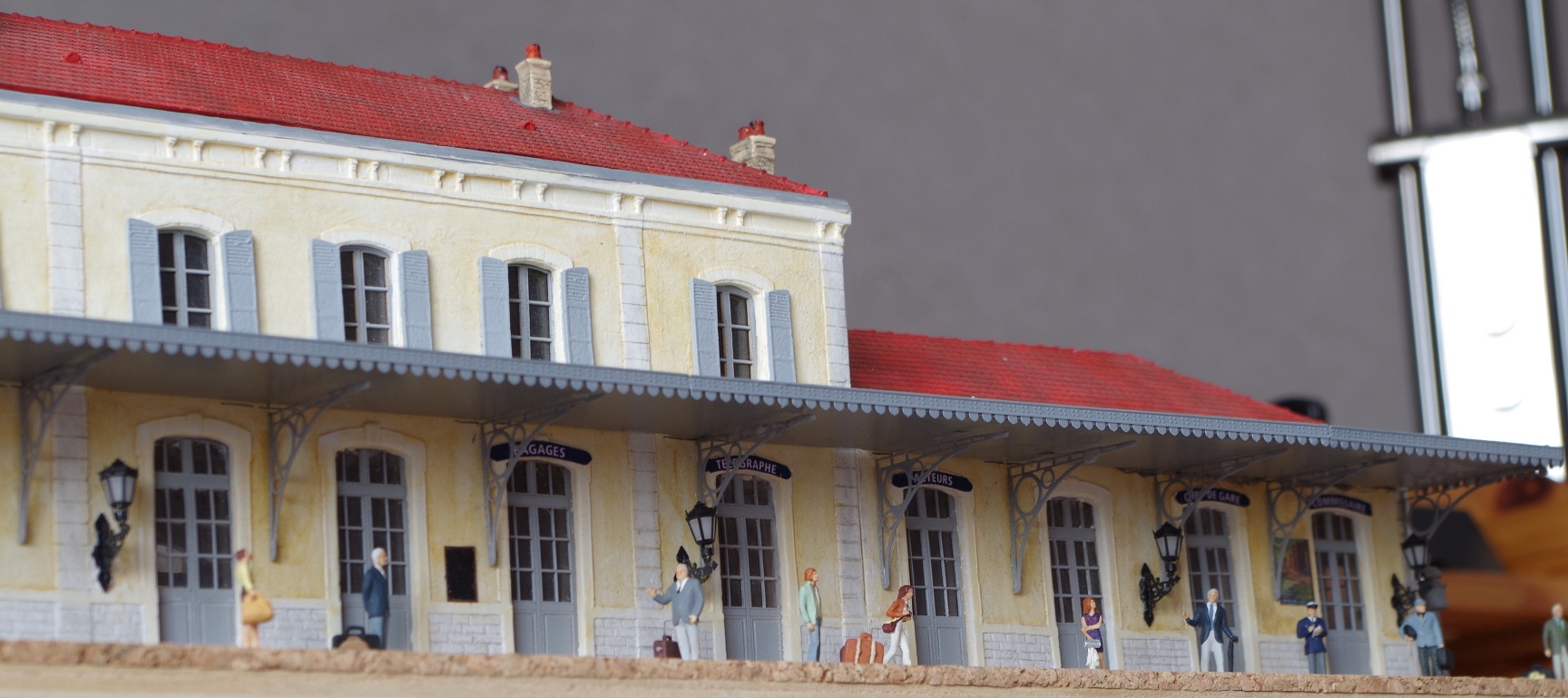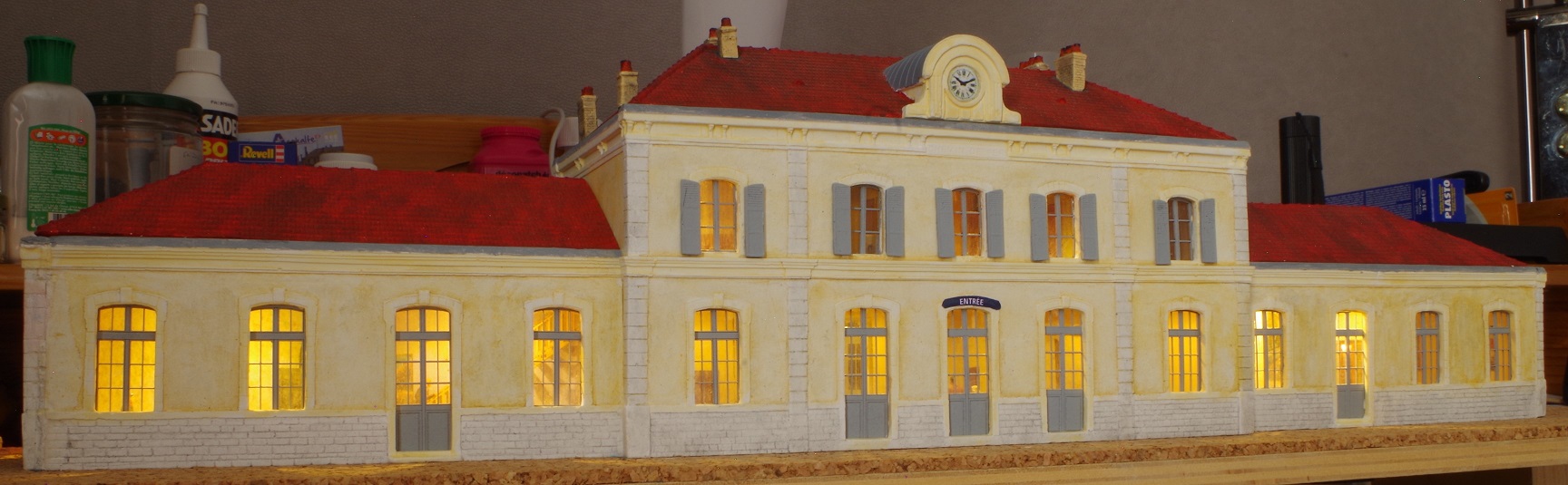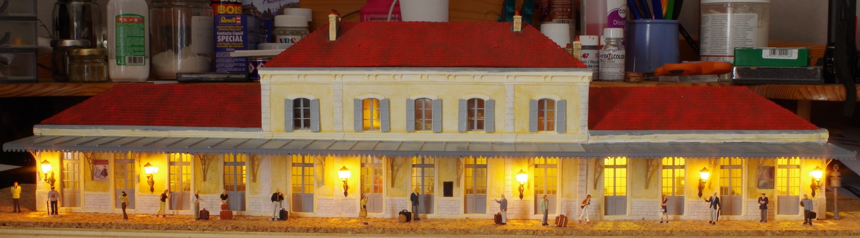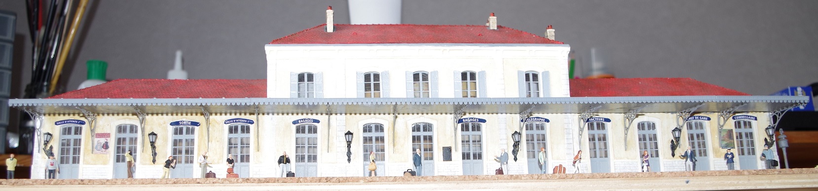 Bonjour à toutes et tous, la gare est enfin terminée (ou presque). il reste les sols côté quai et côté cours. La réalisation se fera lors de