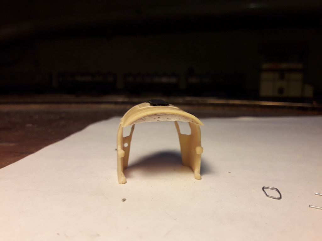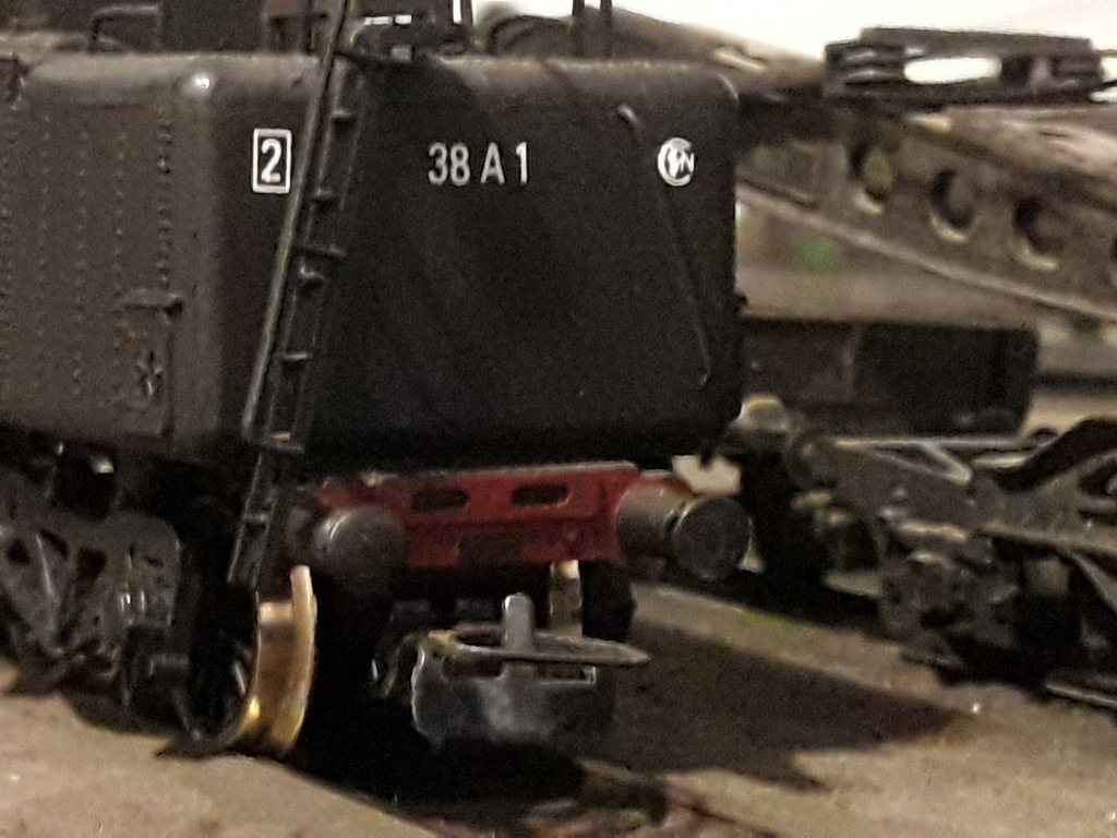 Il faut évidemment gratter les lettres et chiffres en relief Après: J'équipe le châssis de palpeurs pour la liaison électrique avec le tender J'arrase toutes les superstructures du tablier (pompe, compresseurs, turbo dynamo, graisseur Bourdon...) sauf le levier de commande de la coulisse. De même j'arrase et je bouche les fanaux avec du Sintofer, masticage et façonnage.