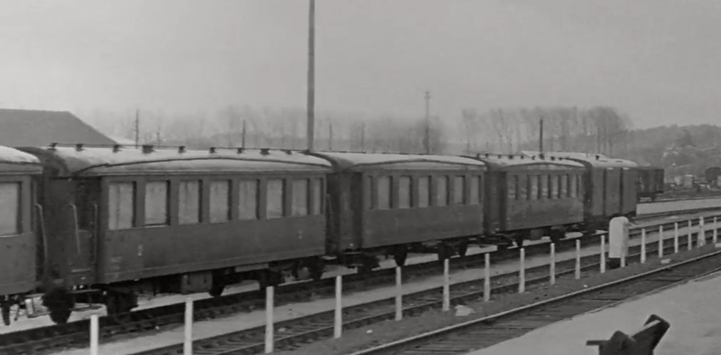 La locomotive à vapeur est une 231 G ex Ouest Etat avec échappement double. On voit le décochement du tablier qui dégage la distribution à soupapes Dabeg. Le plan de voie actuel est plus rectiligne. Il semblerait que la photo soit plutôt prise à l'embranchement qui lui est en courbe pour les besoins du film sur la ligne de Lisieux à Deauville en gare de Lisieux. La halle à marchandise est à la droite du train qui se dirige vers Deauville et l'immeuble se trouve à gauche masquant la ligne vers Cherbourg . A cette époque la ligne pour Deauville était à double voie.