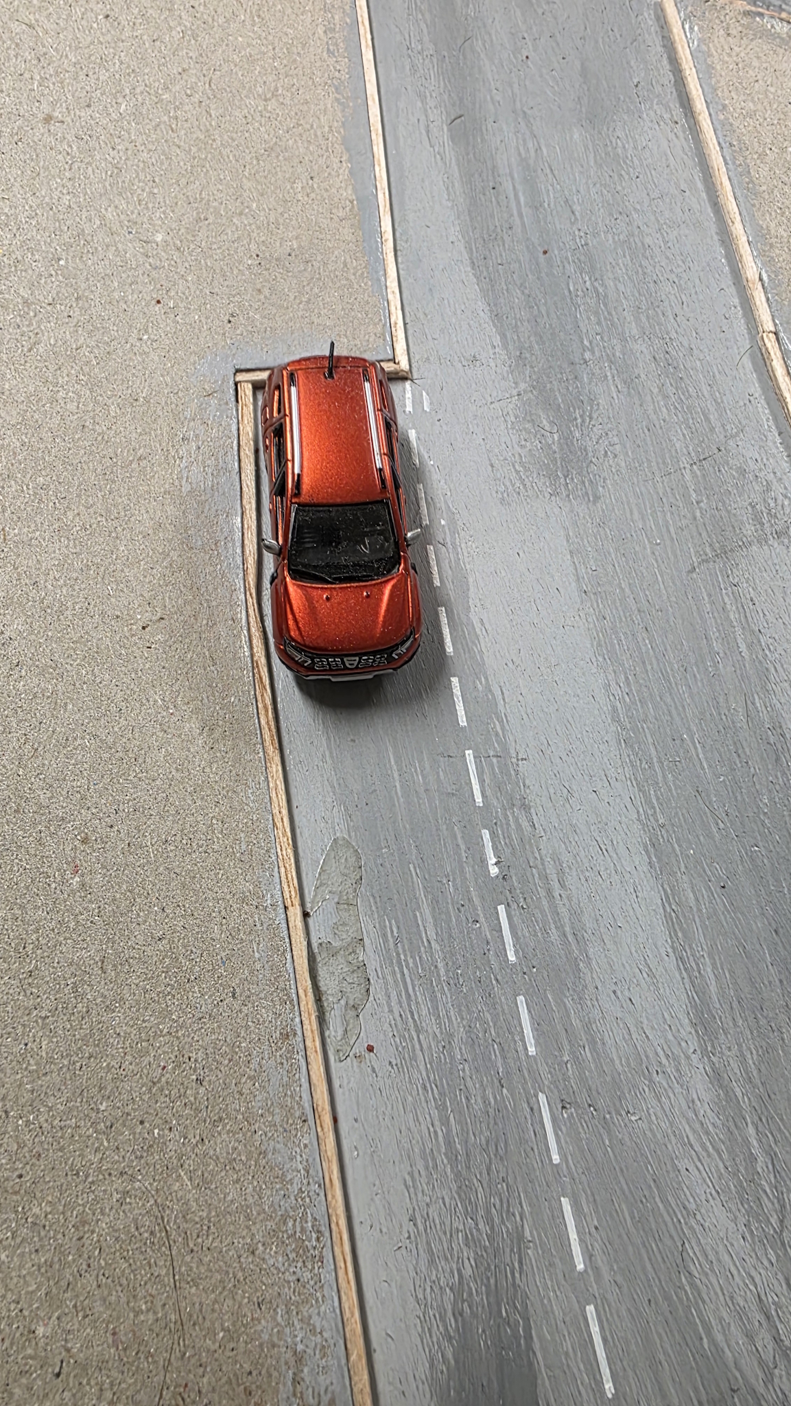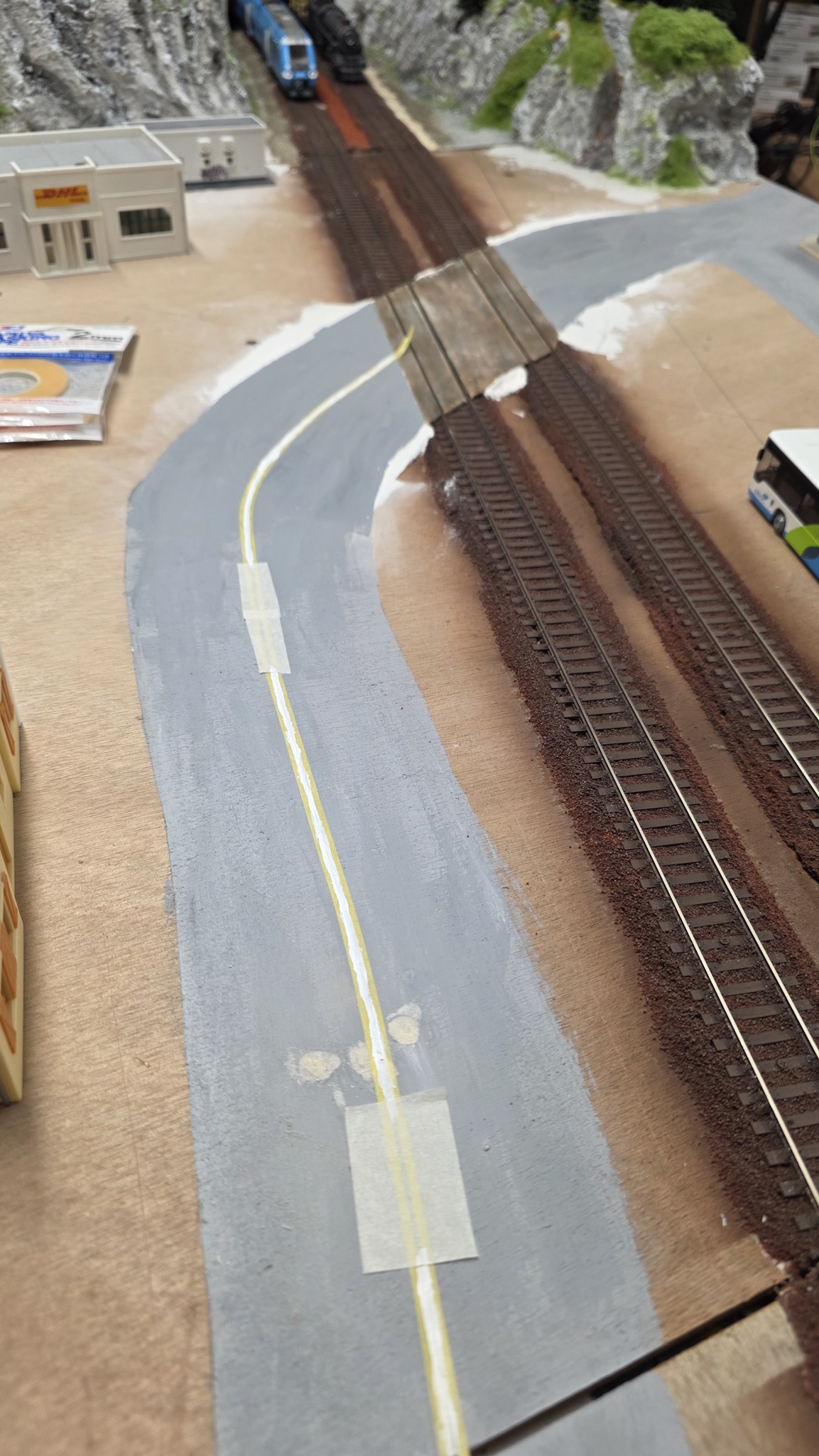 J'ai essayé avec du sable de mer. Pour le teinter, j'ai mis la poudre colorante à sec dans un récipient fermé et j'ai secoué. Ensuite, j'ai saupoudré sur la surface déjà enduite de colle blanche diluée à 50% avec une cuillère à café. C'est le cas de mes pistes longeant la voie et du groupe de signalisation.