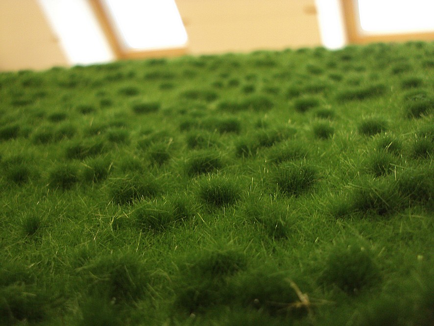 Autre solution, si c'est pour avoir des touffes d'herbes plus hautes comme sur la 2ème photo : Faire des petits trous disposés aléatoirement dans le tapis et y coller des touffes d'herbes assez hautes de différentes couleurs.
