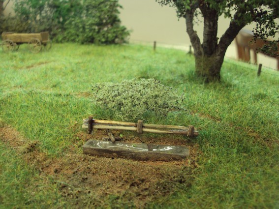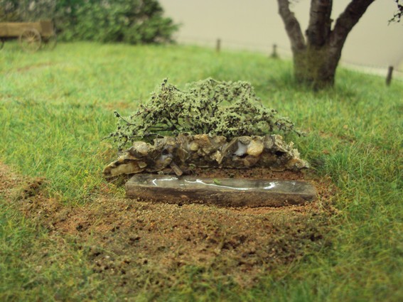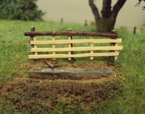 L’arbre est terminé, j’ai appliqué un peu de turf sur la base du tronc. L’abreuvoir est en voie d’intégration, rien n’est sec.