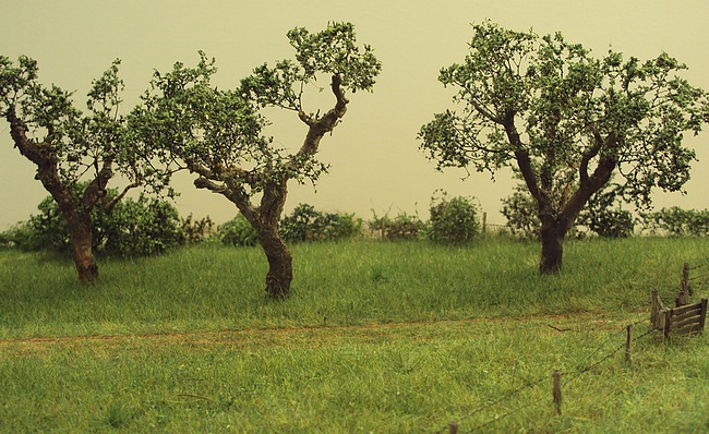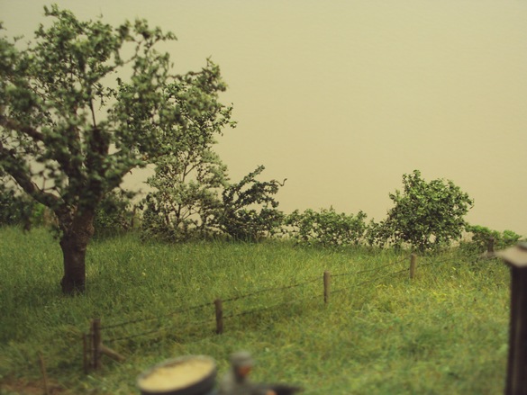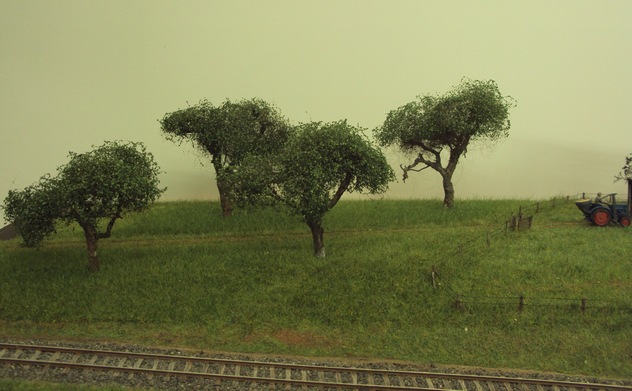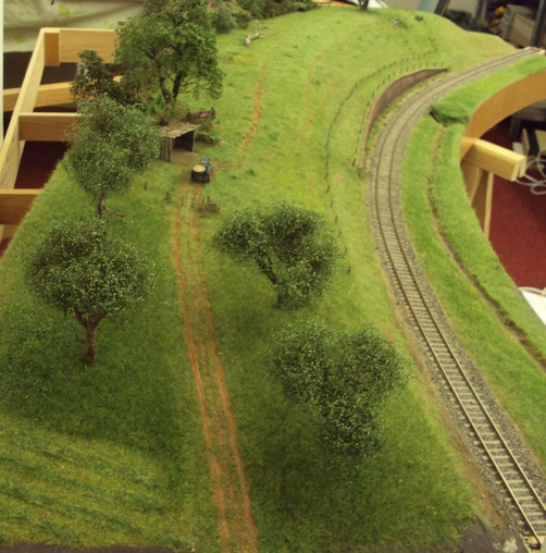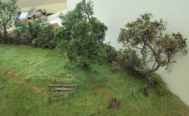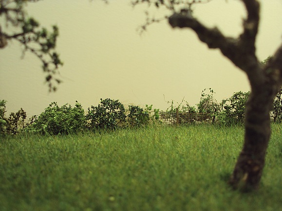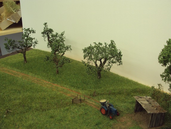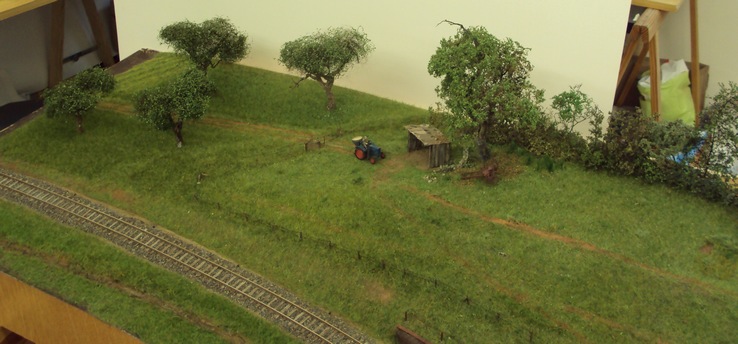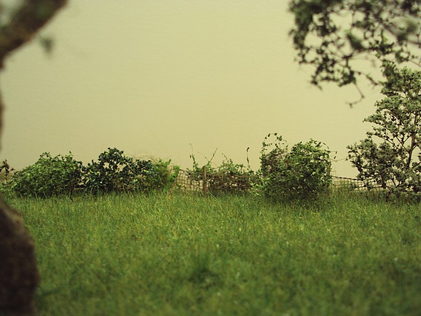 Patrick, le problème c'est que le module sera contre la soupente. L'angle de celle-ci est important. Peu de hauteur pour réaliser la végétation. Il faut que je fasse de la végétation sur une longueur de 60 cm. Il n'y aura pas de fond de décor (simplement un ciel gris bleuté qui fera le tour de la pièce car il y a aussi une soupente de 7,5 m de long de l'autre côté). Je pense faire un panachage : clôture déglinguée, buissons bas et raccord avec l'autre haie (végétaux un peu plus hauts).