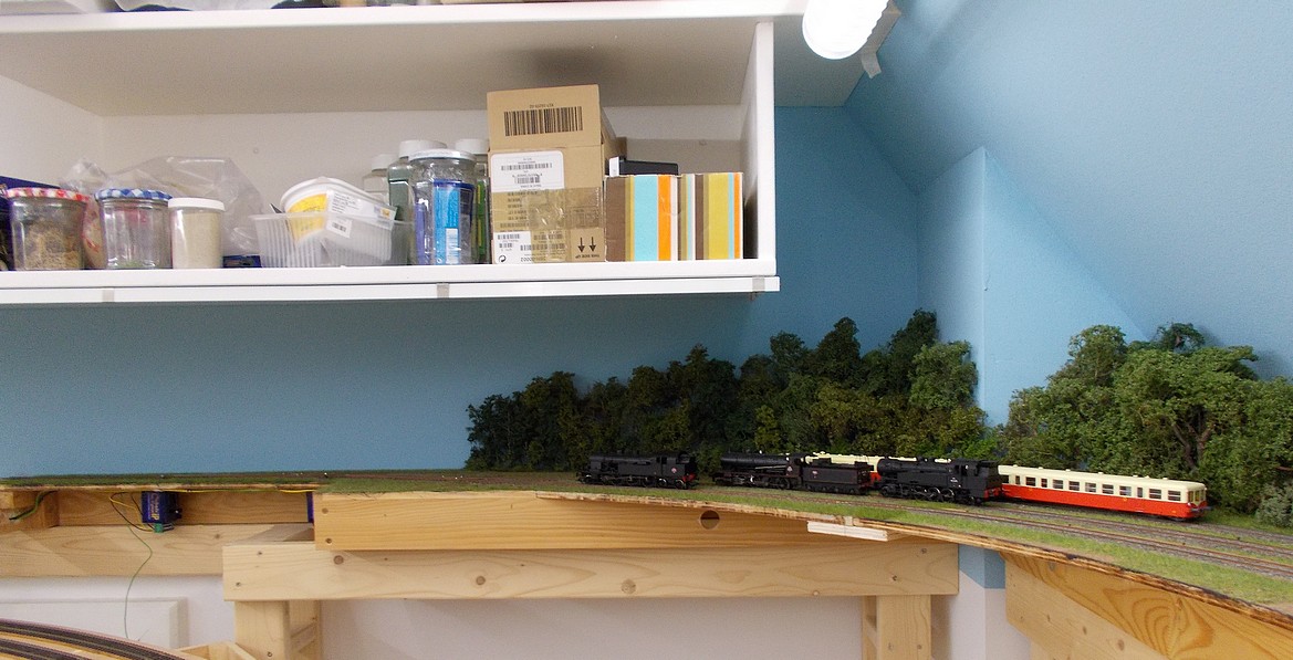 Ce week-end Christian est passé. Nous nous sommes occupés de l’éclairage sous l’étagère car il y avait de l’ombre. Un grand merci à lui. Nous avons mis en place un bandeau de LEDs. L’intensité de l’éclairage peut être réglée. J’ai essayé de faire deux photos qui ne rendent pas très bien malheureusement.