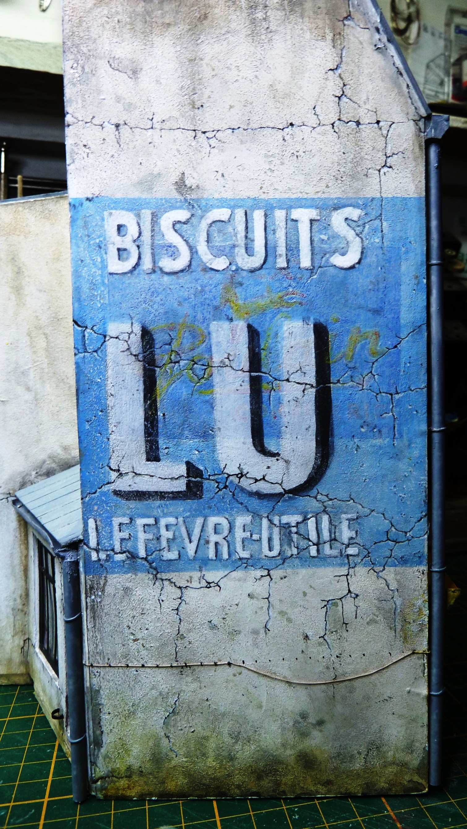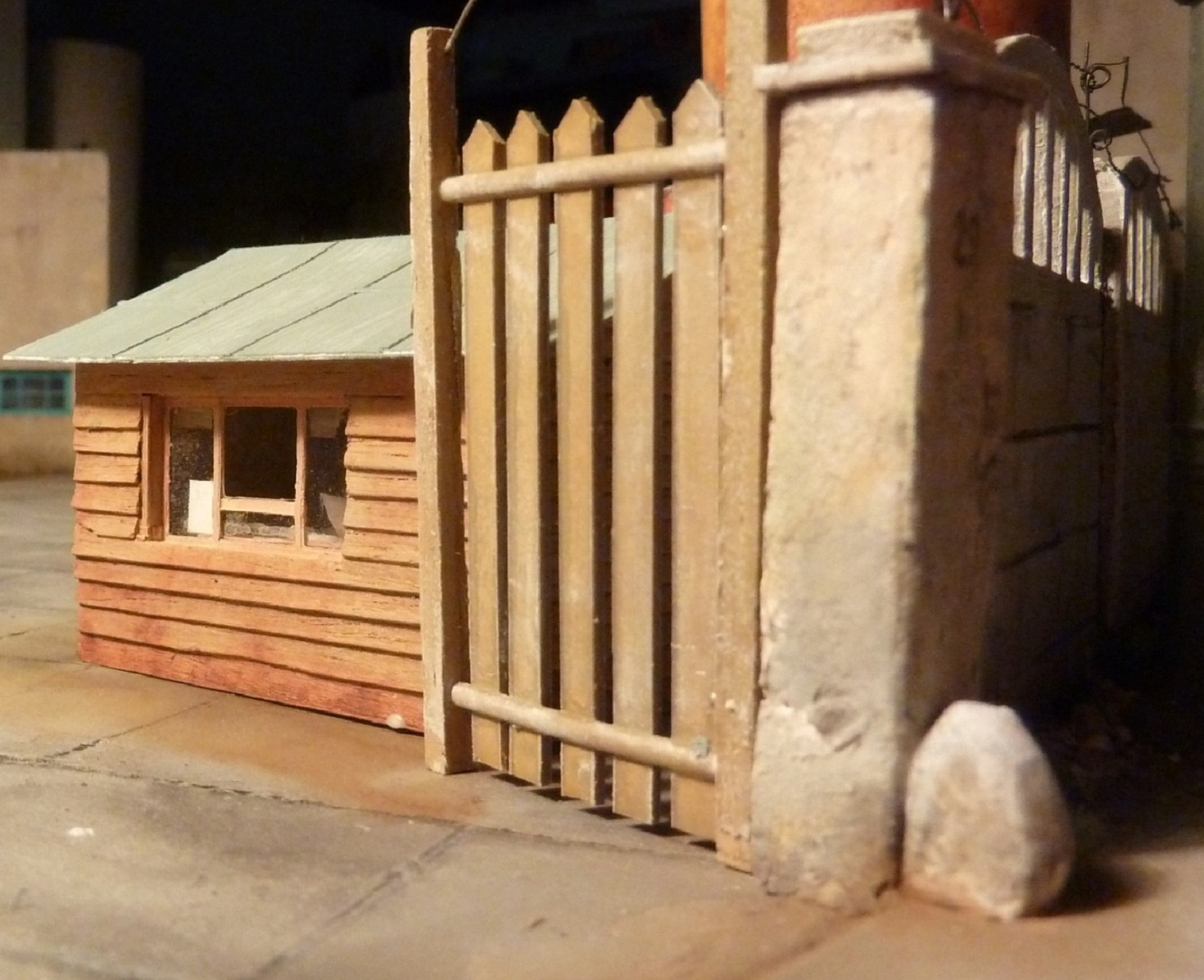 L’abri à brol est en evergreen, toit en PQ sncf sur un carton fin, adossé à un muret de briques gravées dans du dépron de 3mm et des chevrons en balsa gratté.