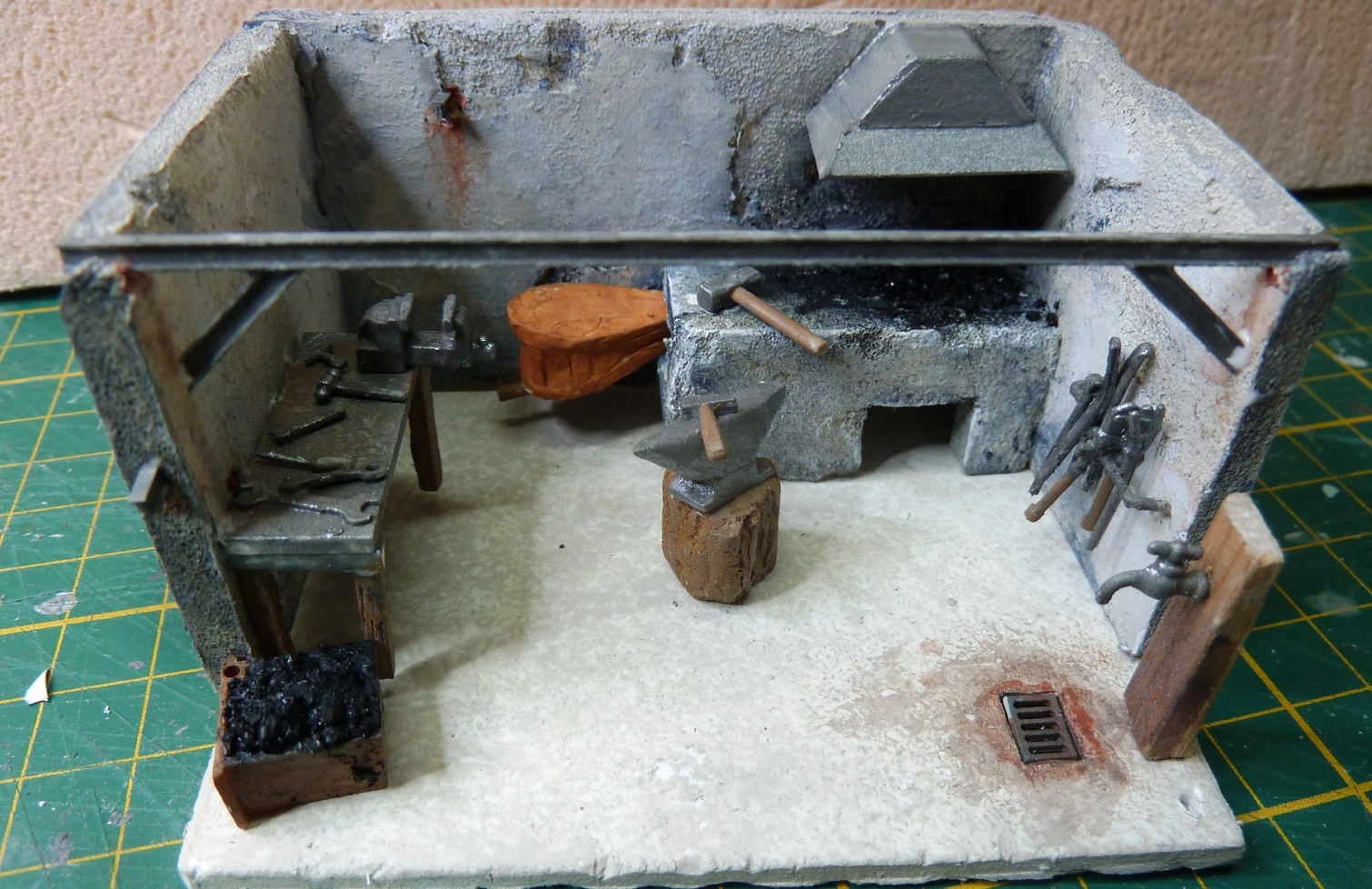 Ensuite, la forge. Carton mousse pelé tant bien que mal ; ça se voit !! Enduit et gesso + acrylique noire et terre de sienne. Le soufflet et la hotte sont en papier à dessin et carton. Le foyer idem avec charbon naturel concassé et une led rouge ( qui ne se voit pas sur les photos ; dommage).