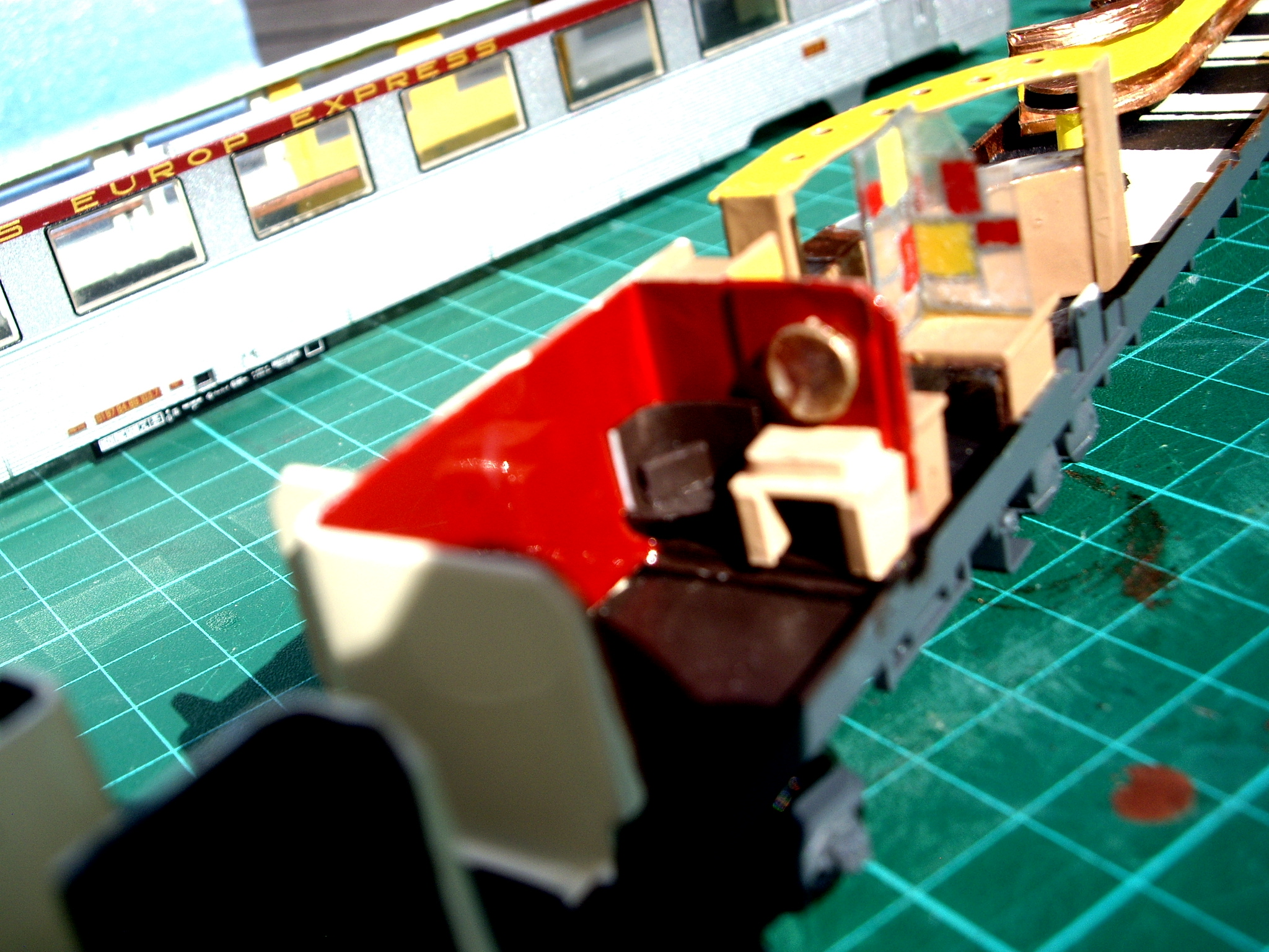 Je n\'ai pas réussi les teintes des cloisons vitrées (framboise et jaune citron). De plus, je n\'obtiens pas une teinte transparente :S .fallait t-il diluer la peinture ? Monsieur Géry NOLAN, auriez-vous quelques indications supplémentaires pour atteindre votre résultat (cf photo 27 p.59 du RMF 566) ?