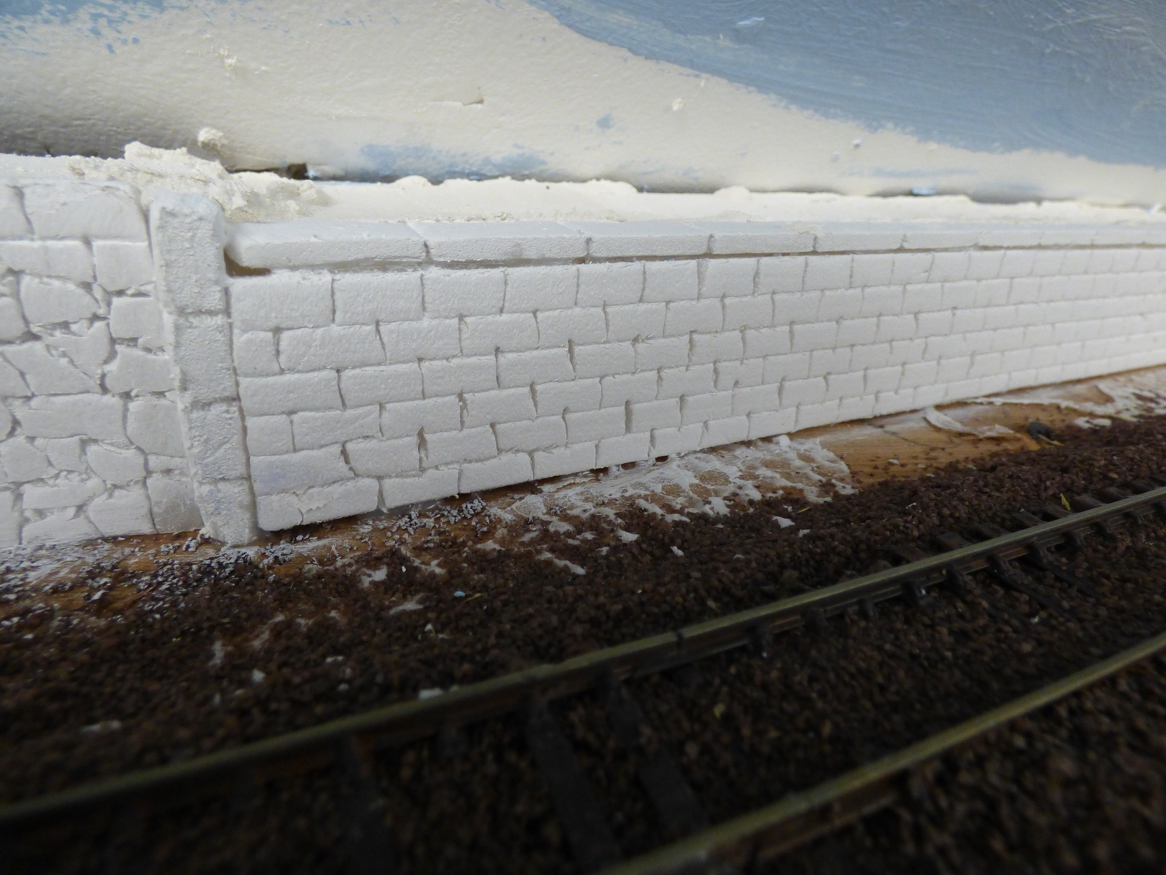 et j'ai attaqué le long de la voie avant l'arrivée en gare,par la pose de murets . Les pierres sont volontairement gravées en laissant des "déchirures" dans le dépron , de façon (du moins je l"espere)