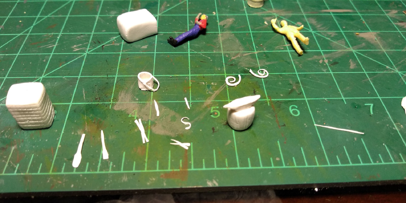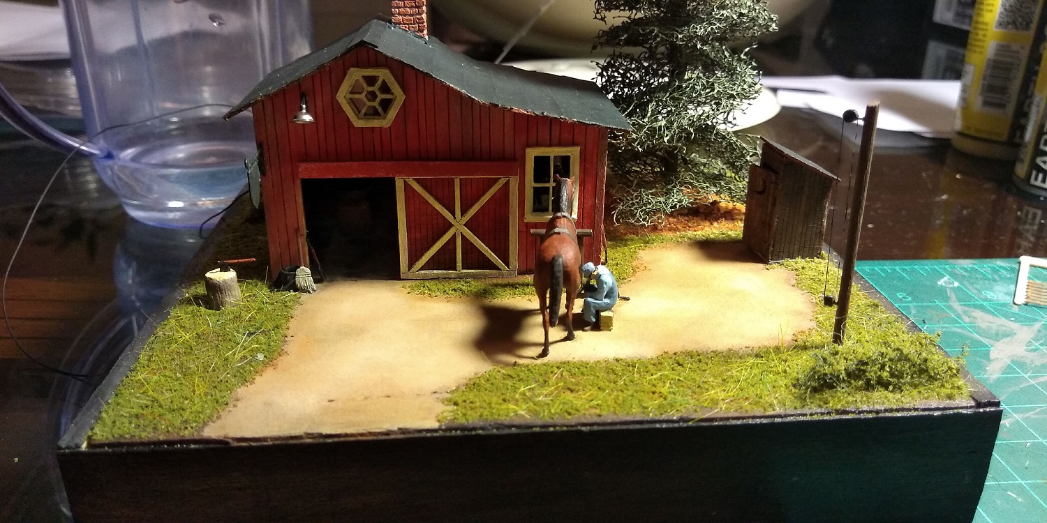 Une petite forge basée sur un modèle à monter de "Blair Line" (je crois). J'ai fabriqué les outils avec de l'argile (attention le temps de cuisson au four !) et j'ai improvisé pour le reste. L'édifice est éclairé ainsi que la forge mais je n'ai pas encore branché les DELs. Les détails viennent d'un peu partout plus construction intégrale.