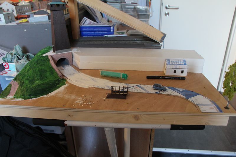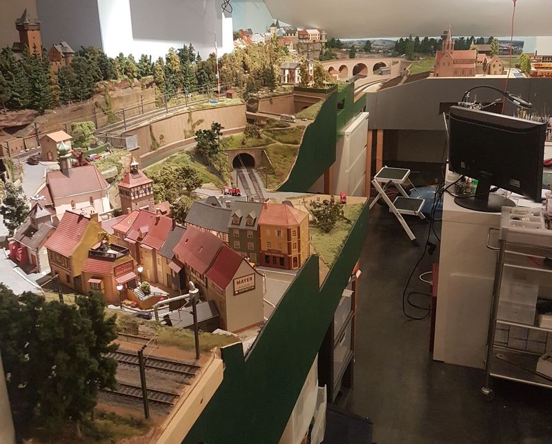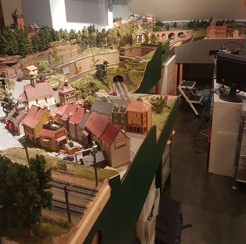 -une partie de transition entre les deux premières parties. Celle-ci est constituée de deux modules de 135x100 cm. Mes deux boucles de retournement se situent sur ces modules aux niveaux inférieurs. Au niveau 0 il y a le cirque PINDER sur le module le plus près de la ville et une abbaye sur le module de continuité du viaduc. Les derniers travaux portent sur cette partie. Du fait de la taille des modules, j'ai créé un "module trappe" afin de pouvoir accéder au fond du réseau.