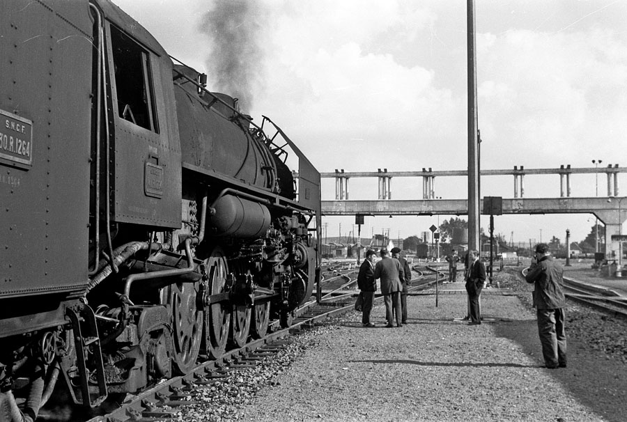 La 1264 a été livrée en juin 1947 à Marseille Blancarde dans sa version fuel avec tender petite capacité 9,5 m3(? pas sûr, car la série avait un châssis moulé, roues Boxpok, bissel delta, penture en Y et macaron SNCF , échappement Kylchap n°1101 à 1340 et avait un tender fuel grande capacité 13 m3). Il se peut qu'au Sud Est qu'elle est été revêtue de la teinte unifiée vert et noire filets rouges . Transformée au charbon en 1956, la 1264 a été affectée à Caen (elle n'a jamais été affectée à Argentan. C'est la 1265, une "Suez" aussi). Sa position en région Ouest m'a fait choisir la robe de Nantes Blottereau mais avec les écrans noir bordure rouge, la boite à fumée et les cylindres noirs. Je n'ai pas gardé la rive du tablier en blanc, une fantaisie qui rappelait la livrée US que j'ai supprimée. Je me suis le plus rapproché de la vraie construite à l'usine de MONTREAL LOCOMOTIVE WORK en mai 47. J'ai conservé les tampons de type US mais je ne suis pas sûr qu'à la livraison elle ai eut des tampons unifiés type OCEM. De même, j'ai laissé la prise d'air du compresseur tourné vers le bas alors que dans cette série selle est tournée vers le haut. Cette machine a été mutée par la suite en Région Nord à Boulogne et elle était entièrement noire crasse unifiée dans cette région. La voici en région Nord en 1966, encore immatriculée à Caen: La voici en service régulier sur mon réseau en concert avec la 141 P 102 de 1973 modifiée et décrite plus haut.