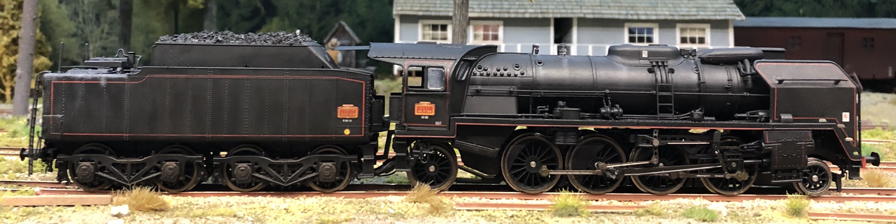 Seb a décrit plus haut sa R Jouef Collection préhistorique moi c'est antédiluvien. Ma 141R 1264 Jouef de 1969 déjà décrite plus haut remotorisée IProd' et sur un autre fil dans son état aujourd'hui plus conforme au réel (une "Suez" fuel transformée au charbon affectée au dépôt de Caen) avec quelques pièces Mécanic Train et d'autres faites maison. Cheminée Kylchap, écrans fins avec la pliure en biais ( pas parallèle au tablier), phares Marshall, nourrice de vapeur, pompe Worthington, vitrage, chandelles de frein, rambardes relevées (un coup de pince suffit) etc, arrière du tender avec poignée de manœuvre des couvercles de prise d'eau, volant de frein, suppression d'un réservoir TIA près de la hotte, échelle...La véritable plaque constructeur Montréal Locomotive Work de chez AXO est sur la première photo, offerte par un internaute ferrovipathe. Auparavant c'était un rectangle de plastique