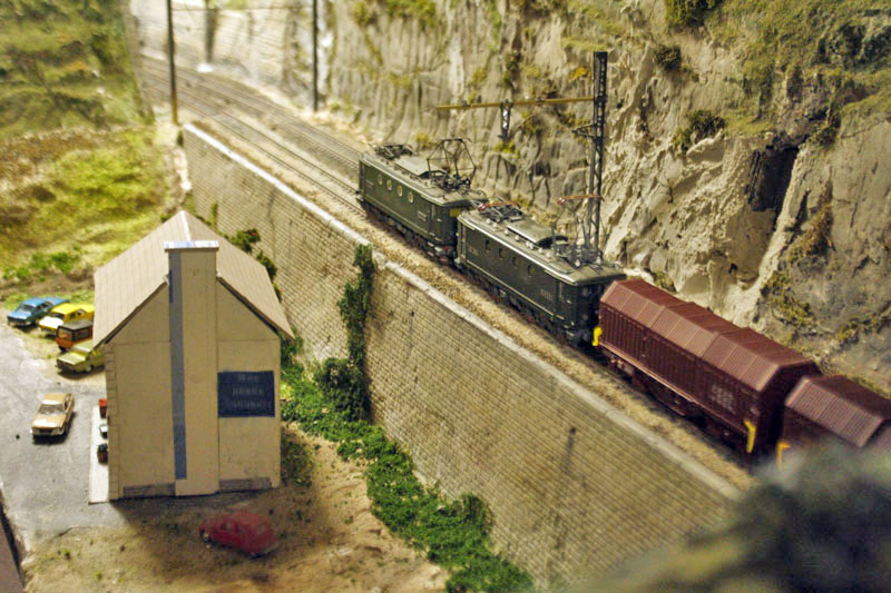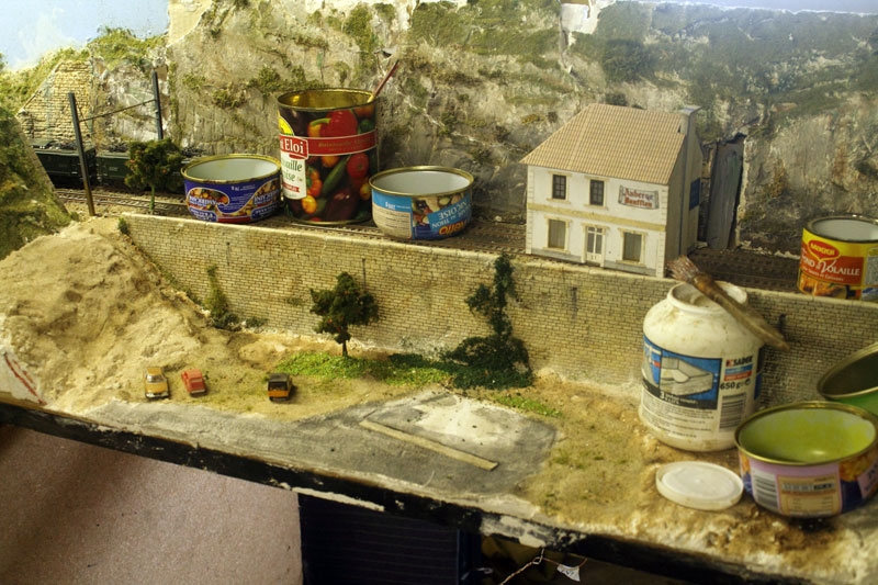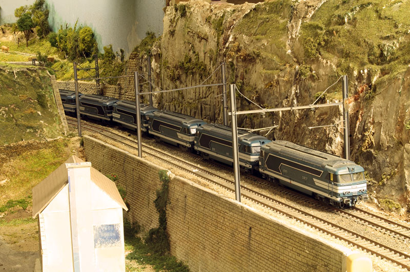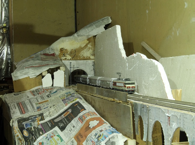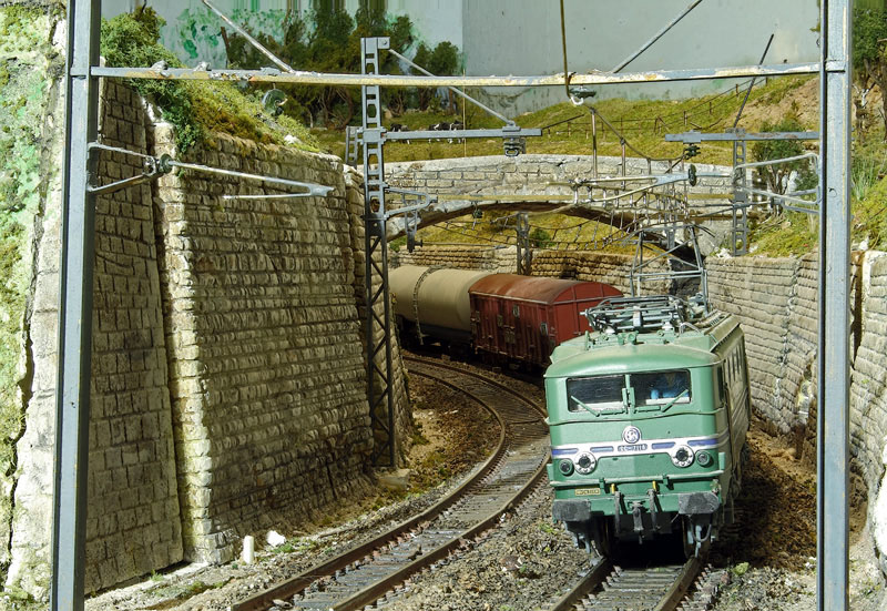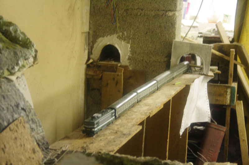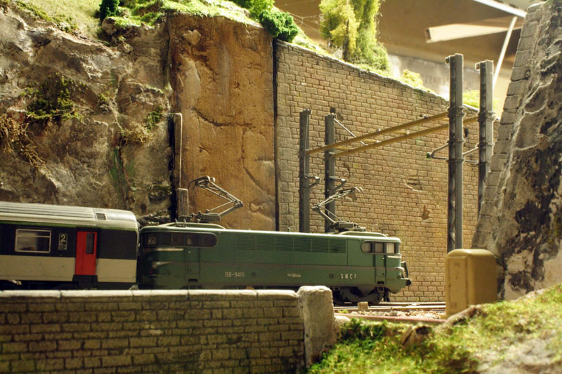A la suite du module amovible de sortie de la gare se trouve une tranchée en courbe qui se termine par un tunnel, c'est l'endroit du réseau ou le rayon de courbe en partie visible est le plus faible: 90 cm. Ce coin n'est toujours pas fini.