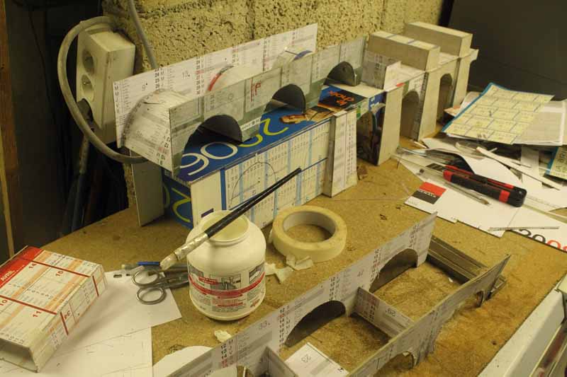 Il est construit en carton de calendriers sur une plateforme en contre plaqué soutenue par trois piliers, le relief sur des couples recouvert de grillages