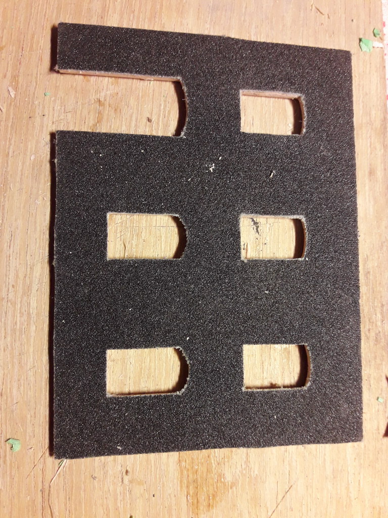 Et coller à la néoprène une feuille de "crépi", du papier abrasif à l'eau grain 150 pour carrosserie de voiture et découpe au XActo.