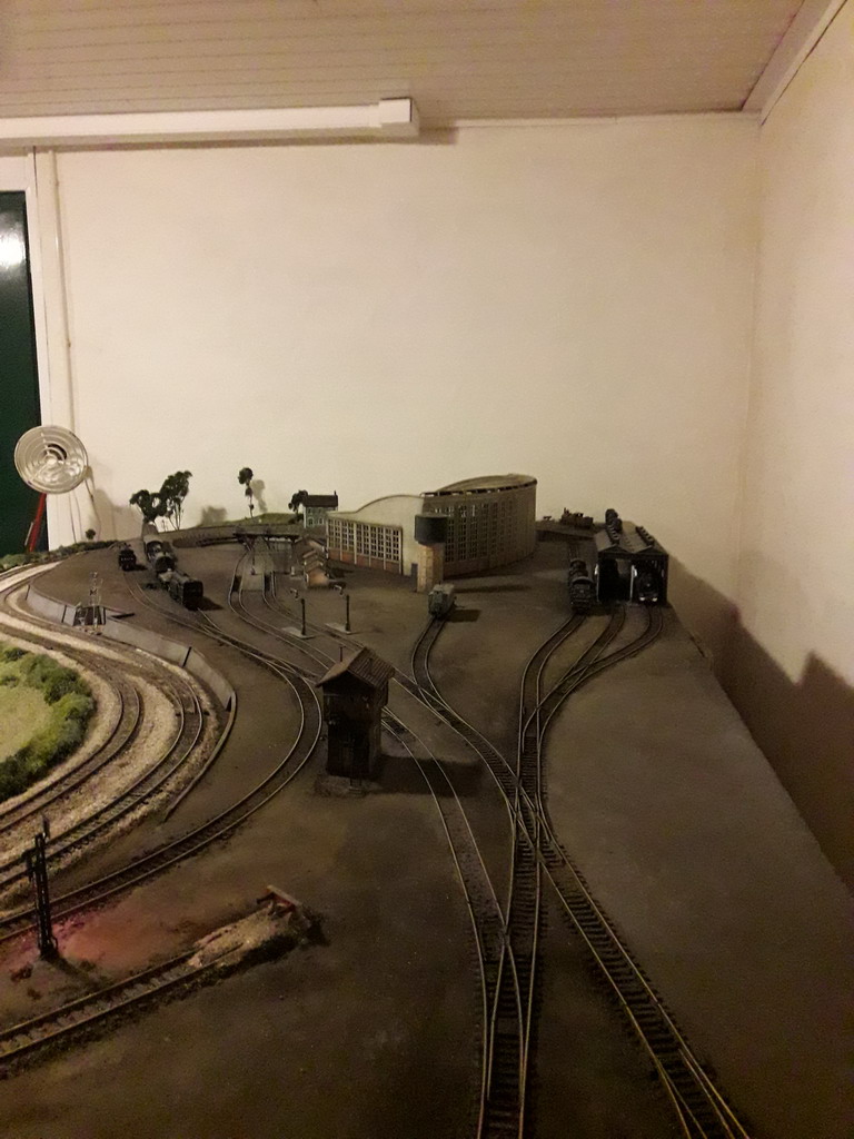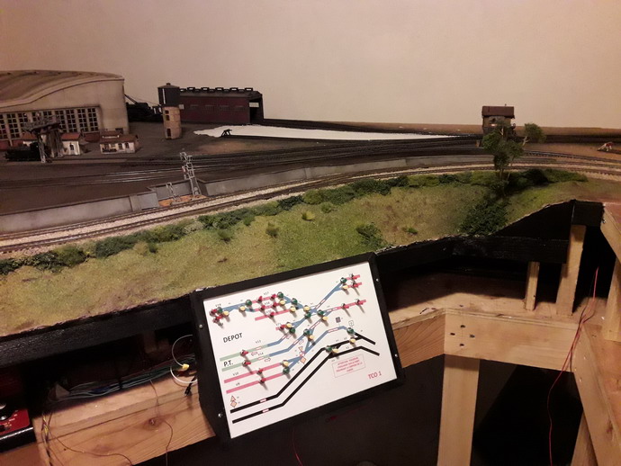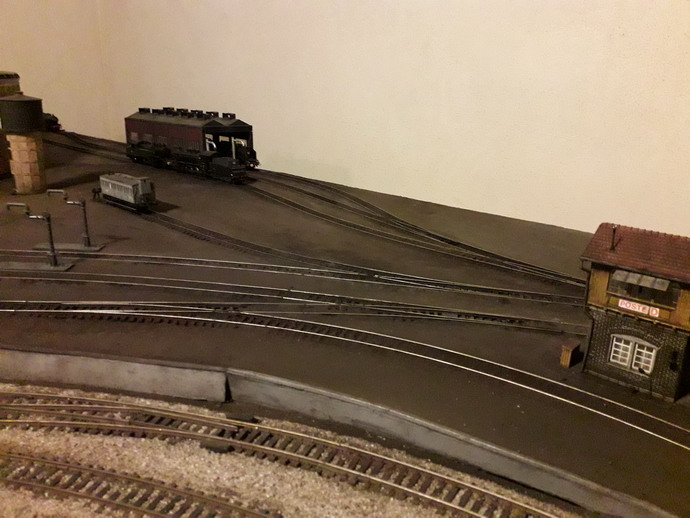 Pendant que je poursuis la construction du foyer, le talus achevé me permet d'équiper définitivement l'alimentation électrique du dépôt. Le Disjonctia Jouef commande la rotation du pont tournant Le bâtiment va se placer derrière le pont tournant à gauche de la photo. Je pense y ajouter une courette coté tranchée. Il va falloir que j'y mettre mes barrières.