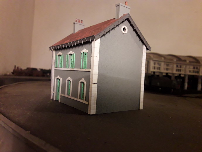 Poursuite de la reconstruction en foyer des roulants de la gare de NEUVY et réutilisant des parties contenant les fenêtres de façades des bâtiments annexes et de la carte plastique pour les pignons qui en fait est extraite de gaines pour câbles électriques.
